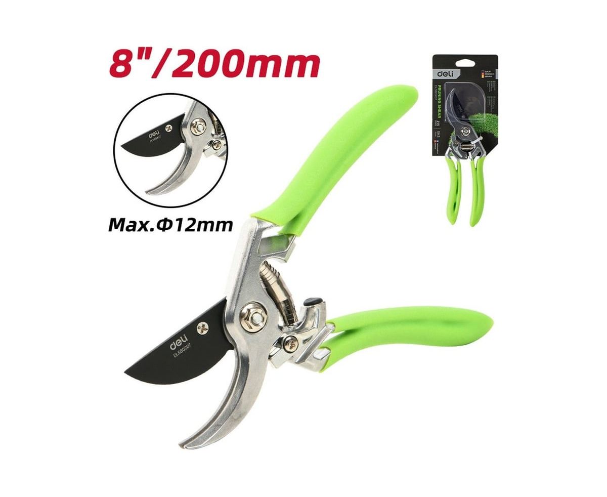 Секатор садовый Deli DL580207 цельнокованный, лезвия с тефлоновым покрытием, длина 215мм, макс. диаметр резки 12мм, сталь SK5