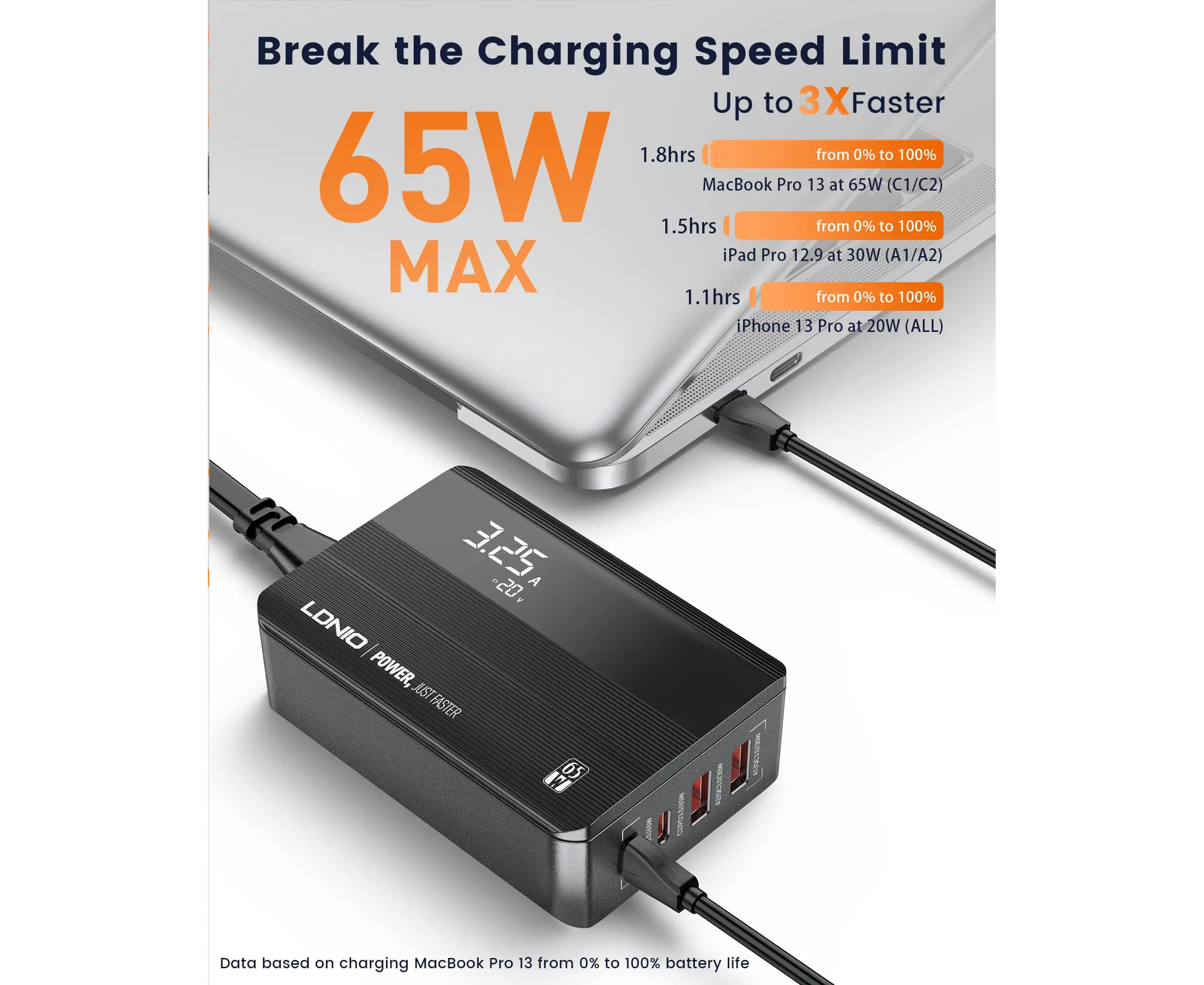 Сетевое зарядное устройство LDNIO A4808Q/ GaN + LED дисплей/ PD+PPS+SCP+QC 4+/ 4 USB/ Выход: 3.3-20V, max 65W/ Черный