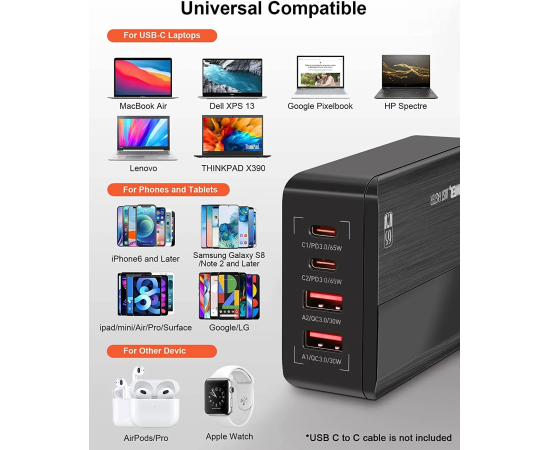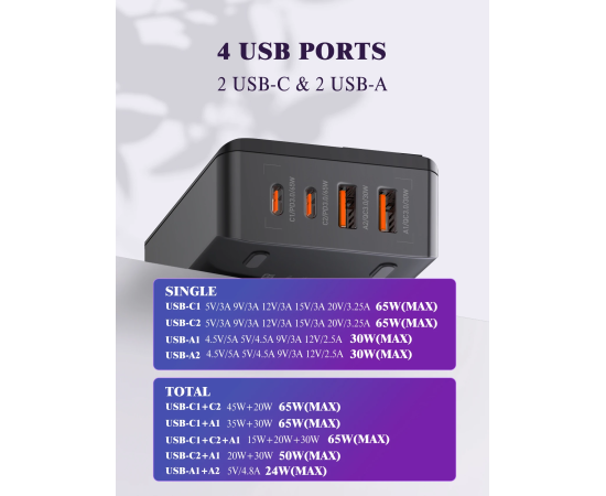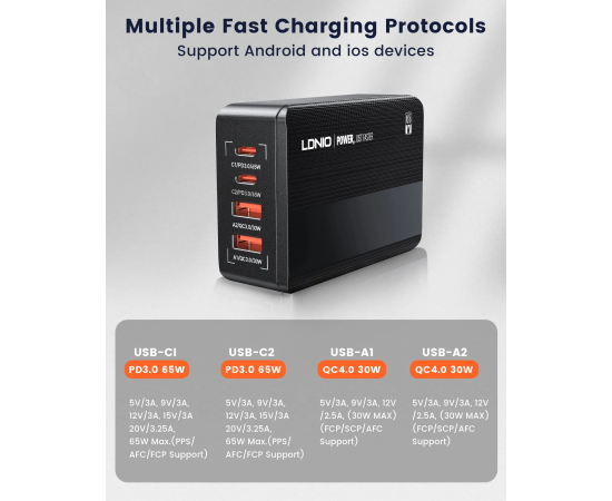 Универсальное зарядное устройство LDNIO A4808Q 65W 2*USB-C 2*USB Чёрный Компактный и портативный настольный блок мощностью зарядки в 65W встроенными протоколами быстрой зарядки делает настольный блок зарядки LDNIO незаменимым в повседневной жизни для зарядки повседневных гаджетов и аксессуаров. USB-C1):5V-3A,9V-3A,12V-3A ,15V-3A,20V-3.25A [65W MAX] (USB-C2): 5V-3A,9V-2.22A,12V-1.67A [20W MAX] (USB-A1):5V-3A,9V-3A,12V-2.5A [30W MAX] (USB-A1):5V-3A,9V-3A,12V-2.5A [30W MAX]