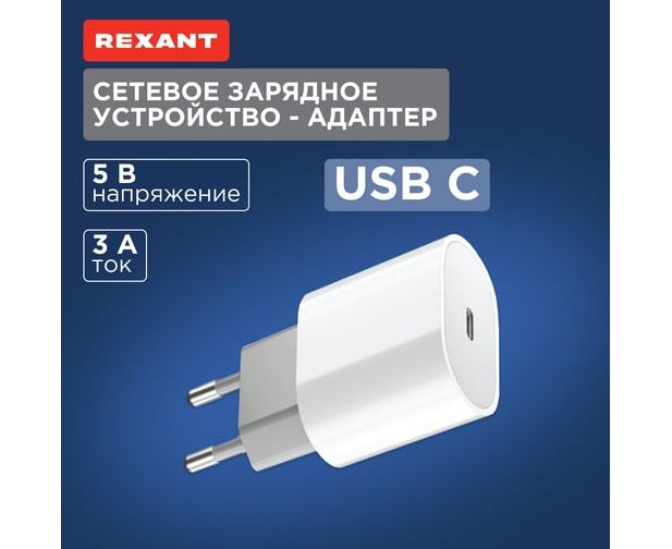 Сетевое зарядное устройство REXANT — это компактное и мощное устройство для подзарядки различных гаджетов. Оно поддерживает стандарт быстрой зарядки Power Delivery 3.0 и имеет выходную мощность 20 Вт.
