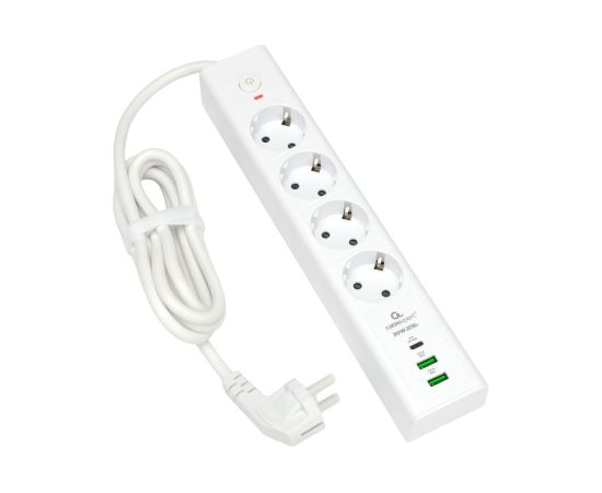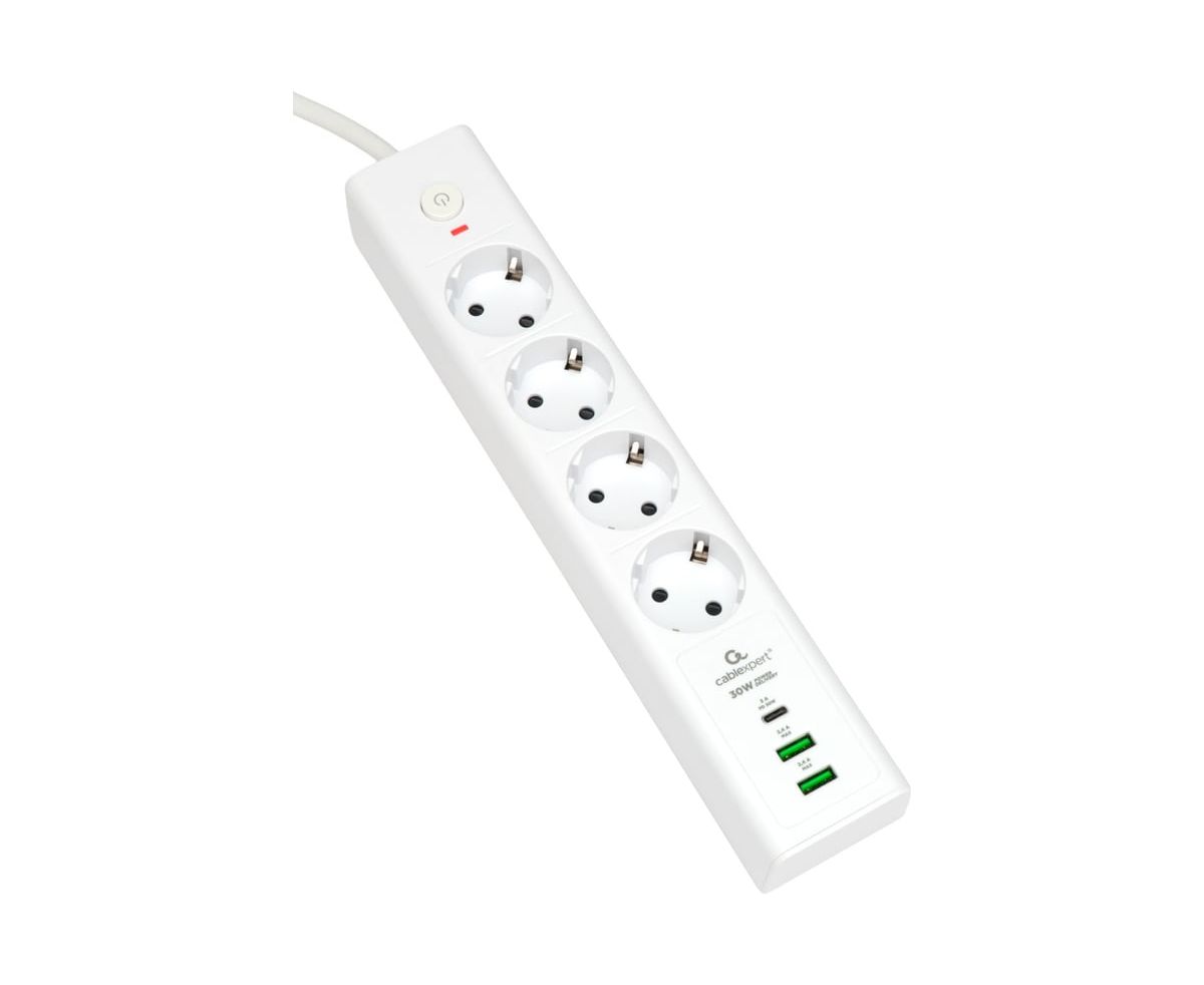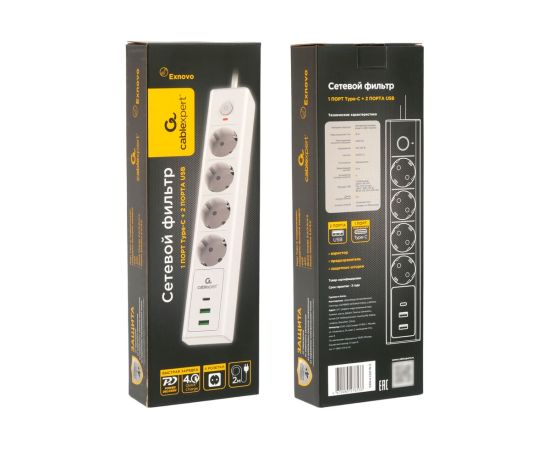 Сетевой фильтр Cablexpert Exnovo EXN-4-CU2-W-2 белый, Макс мощность 2500Вт, 3 розетки 220В, 10А, 2 розетки USB-A 5В, 1 розетка USB-C 30Вт PD