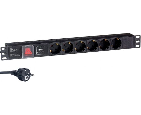 горизонтальный блок розеток, евровилка с заземлением, розетки: 6x Schuko, макс. ток нагрузки 16A, фильтр защиты, выключатель с подсветкой, стандарт VDE, EAC, кабель 2м