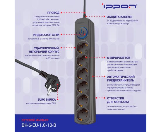 Сетевой фильтр Ippon BK-6-EU-1.8-10-B (1.8м 6 розеток черный)