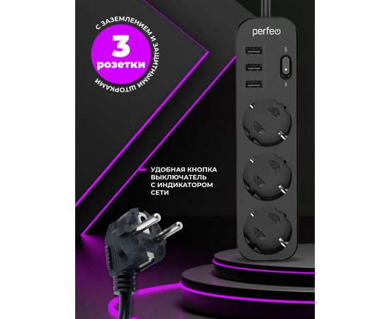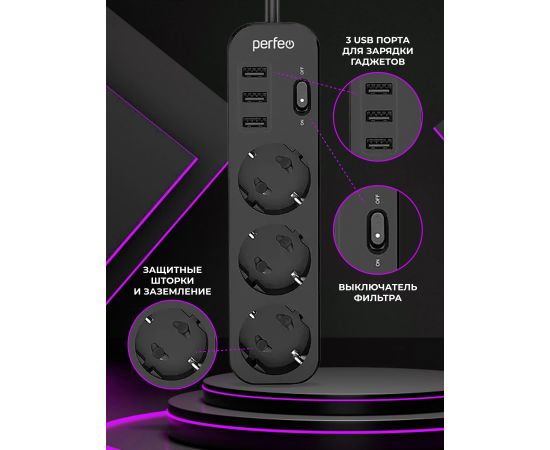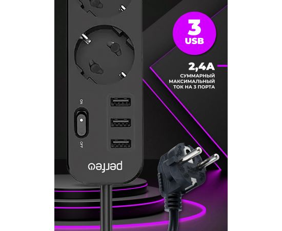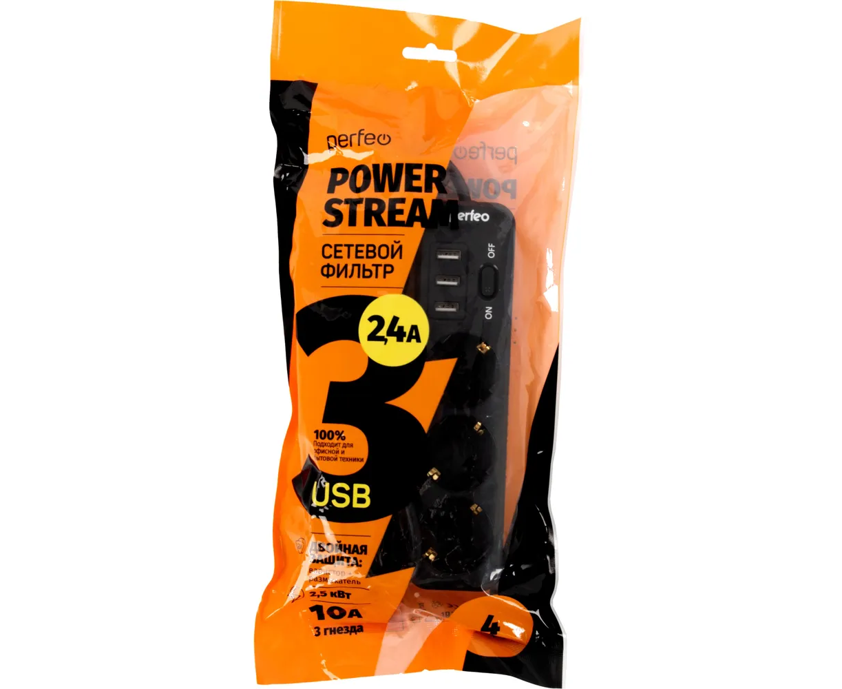Сетевой фильтр Perfeo "POWER STREAM", 2500W, двойная защита, 4м, 3 розетки, 3 USB, черный.