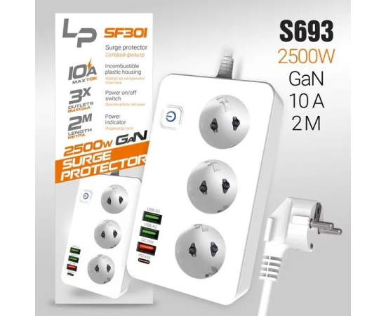 Сетевой фильтр-удлинитель LP SF301 3розетки 3USB A+C Gan 45W/10А 2500W 2м white