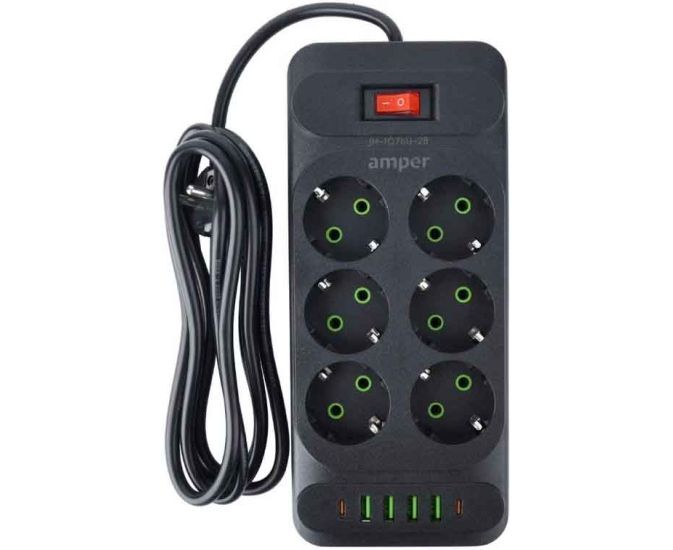 Сетевой удлинитель Amper JH-1076U-2B 2,0м, 6 розеток черный