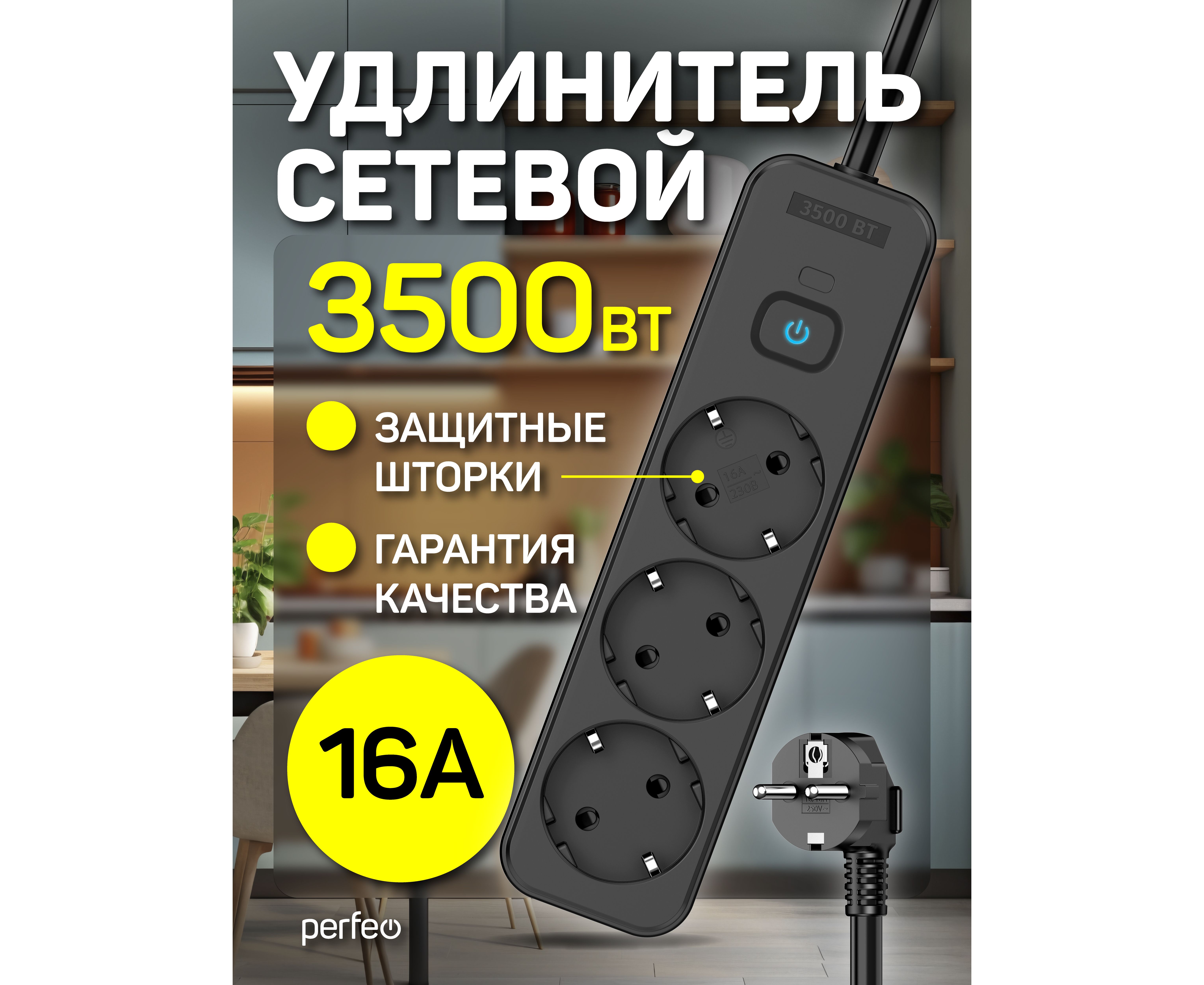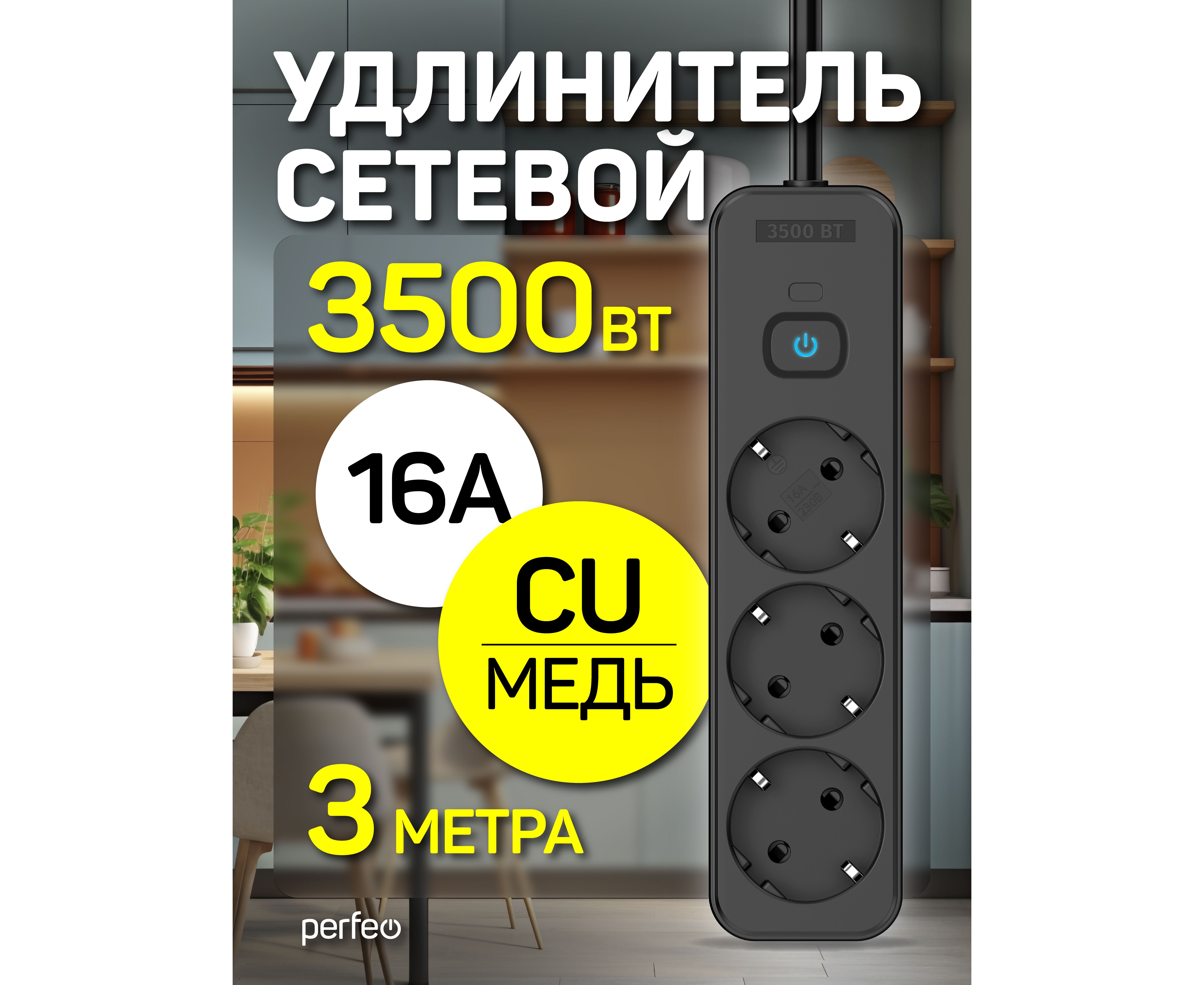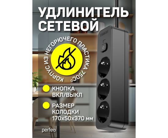 Сетевой удлинитель Perfeo "REAL STRIP" 3,0м, 3 розетки, 16А, 3500 Вт, черный