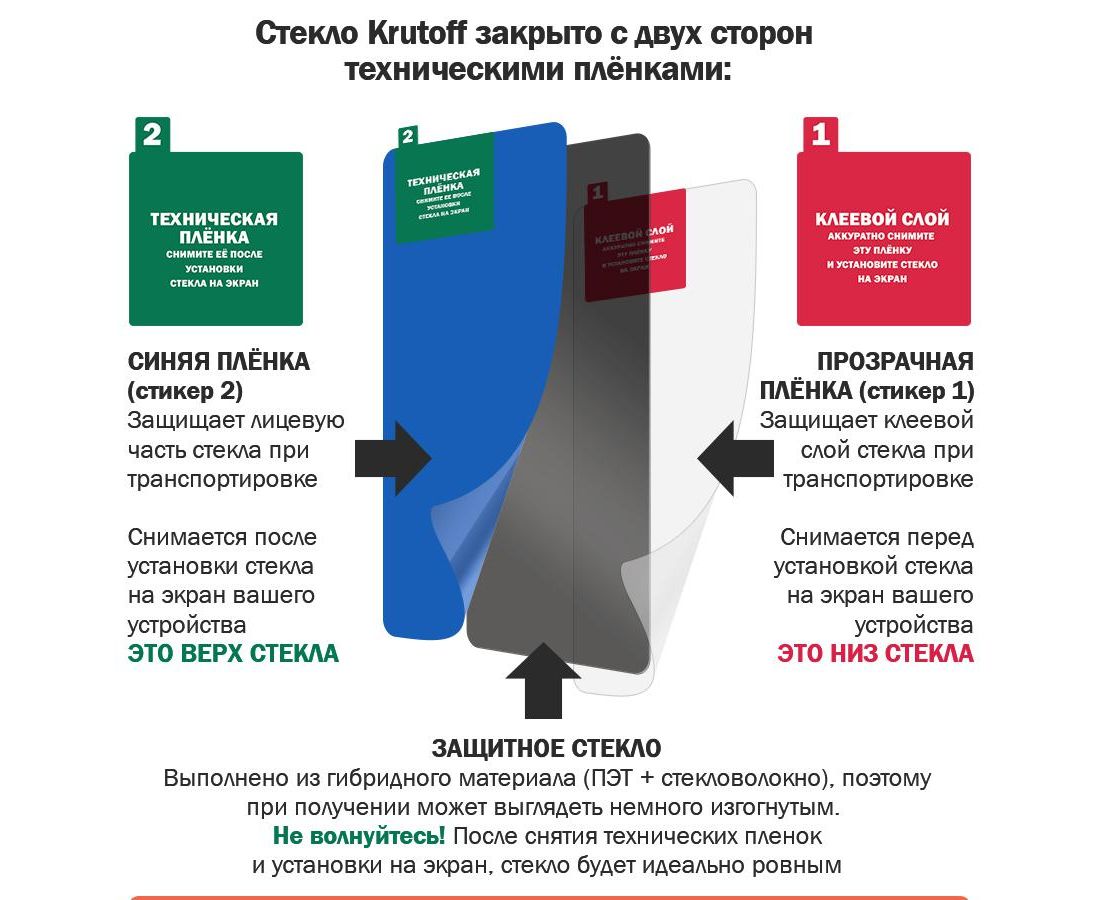 ГИБРИДНОЕ защитное стекло для Вашего смартфона сохраняет гибкость защитной пленки, и прочность стекла. Оно намного удобнее обычного закаленного стекла - как при транспортировке, так и при установке. Гибридное стекло тоньше, прочнее и надежно защищает смартфон от повреждений. Имеет отступы по 1 мм от края дисплея для удобства ношения защитного чехла. Оно имеет высокую степень устойчивости к царапинам, обеспечивает хорошую чувствительность к касанию и не влияет на сенсорный отклик по всей поверхности дисплея. Идеально прозрачное, не снижает четкость и яркость изображения, не меняет оригинальную цветопередачу. Изготовлено из гибкого композиционного материала (стекловолокно и ПЭТ). Верхний слой из стекловолокна по тактильным ощущениям близок к стеклу и не влияет на работу сенсора по всей поверхности экрана. Гибридное стекло гибкое, оно не растрескивается и не крошится, как обычное закаленное стекло. Защищает от пыли, грязи, брызг и царапин. Полная проклейка поверхности (Full Glue). Специальная смесь высококачественных клеев гарантирует установку без пузырьков воздуха и что стекло не отслоится с течением времени. Обращаем Ваше внимание, что при использовании гибридного стекла с функцией "антишпион" сканер отпечатка пальца не работает! Внимание! Гибридное стекло поставляется в двух защитных транспортировочных пленках (на тыльной и лицевой стороне). Данные пленки могут быть поцарапаны. После наклеивания стекла снимите защитную синюю пленку "2" с лицевой стороны!