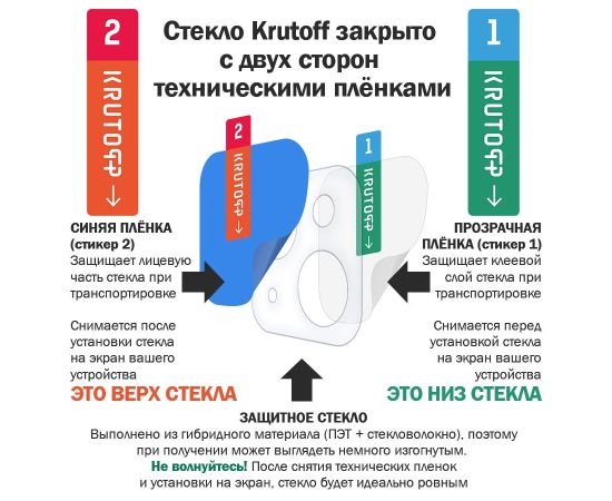 ГИБРИДНОЕ защитное стекло для Вашего смартфона сохраняет гибкость защитной пленки, и прочность стекла. Оно намного удобнее обычного закаленного стекла - как при транспортировке, так и при установке. Гибридное стекло тоньше, прочнее и надежно защищает смартфон от повреждений. Имеет отступы по 1 мм от края дисплея для удобства ношения защитного чехла. Оно имеет высокую степень устойчивости к царапинам, обеспечивает хорошую чувствительность к касанию и не влияет на сенсорный отклик по всей поверхности дисплея. Идеально прозрачное, не снижает четкость и яркость изображения, не меняет оригинальную цветопередачу. Изготовлено из гибкого композиционного материала (стекловолокно и ПЭТ). Верхний слой из стекловолокна по тактильным ощущениям близок к стеклу и не влияет на работу сенсора по всей поверхности экрана. Гибридное стекло гибкое, оно не растрескивается и не крошится, как обычное закаленное стекло. Защищает от пыли, грязи, брызг и царапин. Полная проклейка поверхности (Full Glue). Специальная смесь высококачественных клеев гарантирует установку без пузырьков воздуха и что стекло не отслоится с течением времени. Внимание! Гибридное стекло поставляется в двух защитных транспортировочных пленках (на тыльной и лицевой стороне). Данные пленки могут быть поцарапаны. После наклеивания стекла снимите защитную синюю пленку "2" с лицевой стороны!