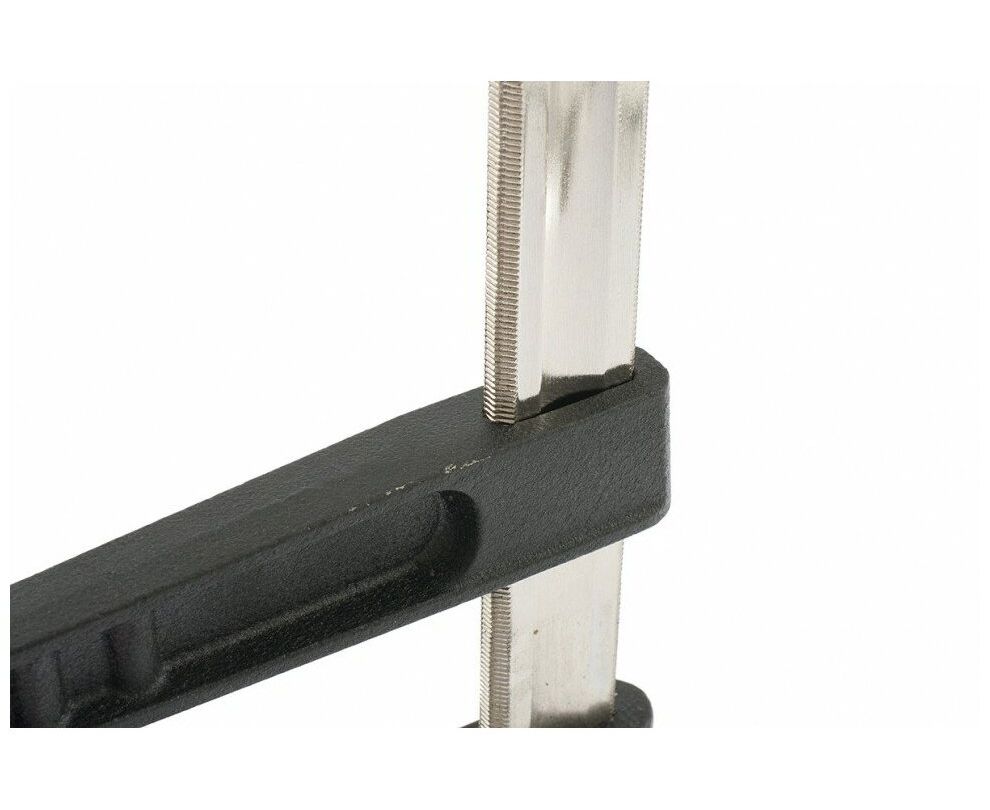 F-образная струбцина обеспечивает оптимальную силу сжатия, которая прижимает к верстаку детали либо удерживает их плотно сжатыми между собой. Для стягивания губок имеется удобная двухкомпонентная рукоятка.Прочный винт равномерно распределяет нагрузку по резьбе - исключает срыв. Штанга также выдерживает направленные нагрузки.