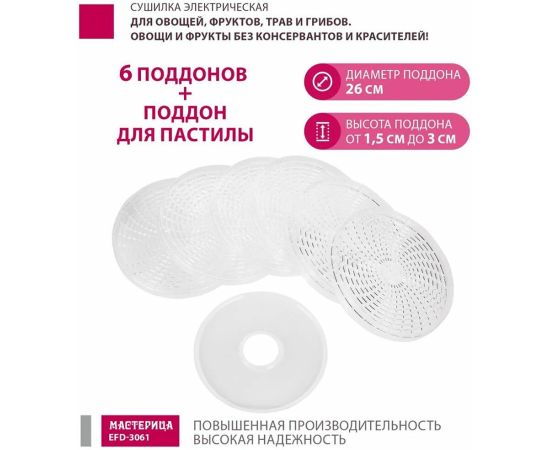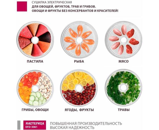 Используйте электросушилку для овощей и фруктов Мастерица EFD-3061 как дегидратор для мяса или рыбы и угощайте близких различными деликатесами, а со специальным поддоном для пастилы вы откроете для себя мир полезных сладостей.