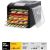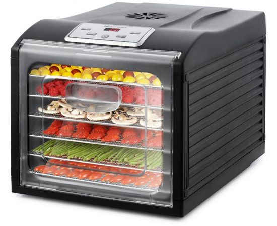 Особенности: 6 поддонов из нержавеющей стали; 6 поддонов для жидкости; 6 сеток для мелких продуктов; горизонтальный обдув; низкий уровень шума; защита от перегрева; электронное управление; регулировка температуры; таймер до 19,5 часов с шагом 30 минут; температура сушки: 35-70 °С с шагом 5 °С