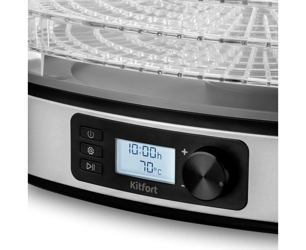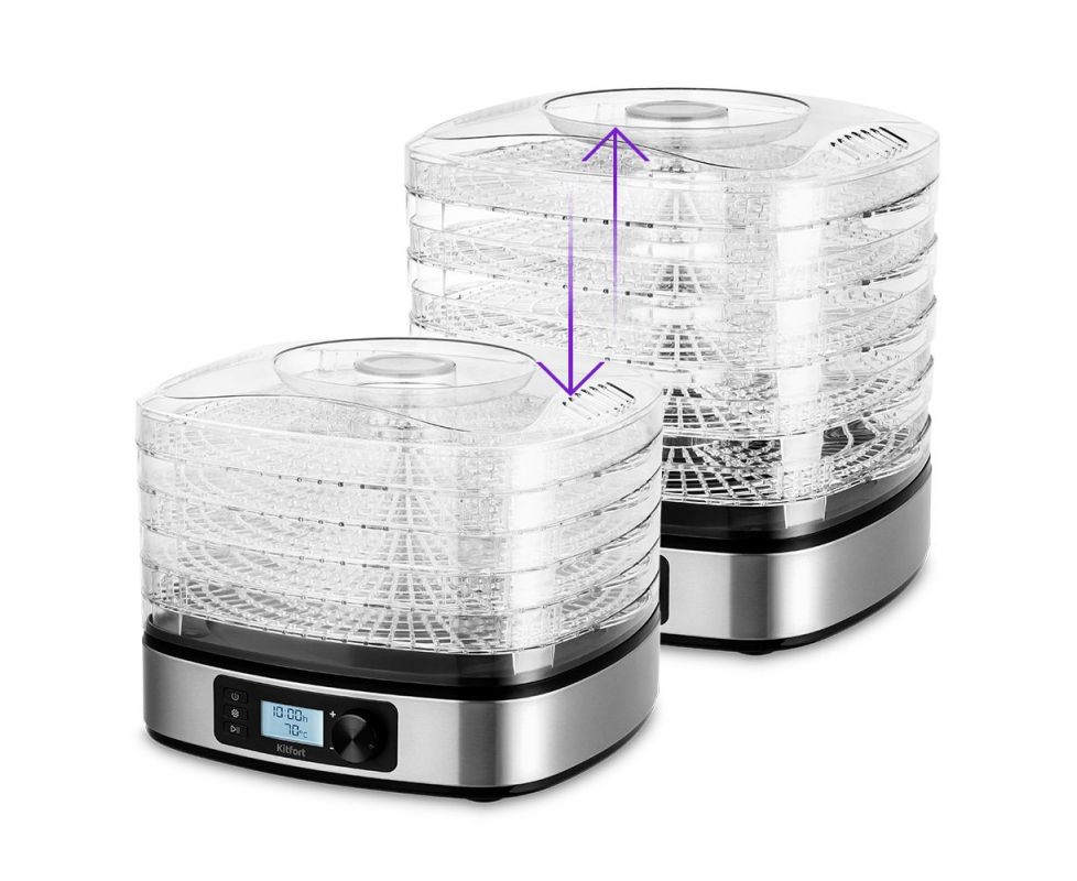 Сушилка Kitfort KT-1943 имеет в комплекте 5 поддонов из прозрачного пластика, вы можете регулировать их по высоте благодаря специальным выступам. Пластик BRA-free не содержит Бисфенол А, а значит — полностью безопасный для здоровья.