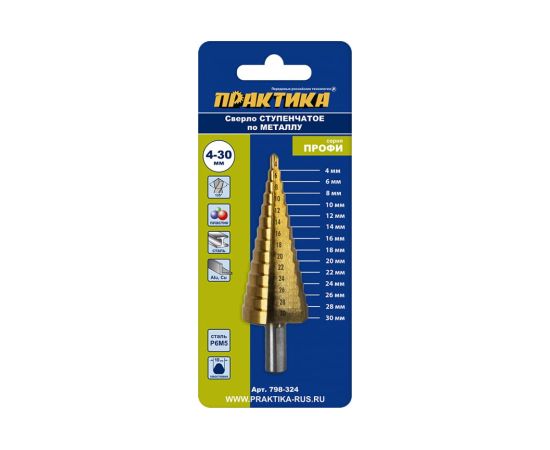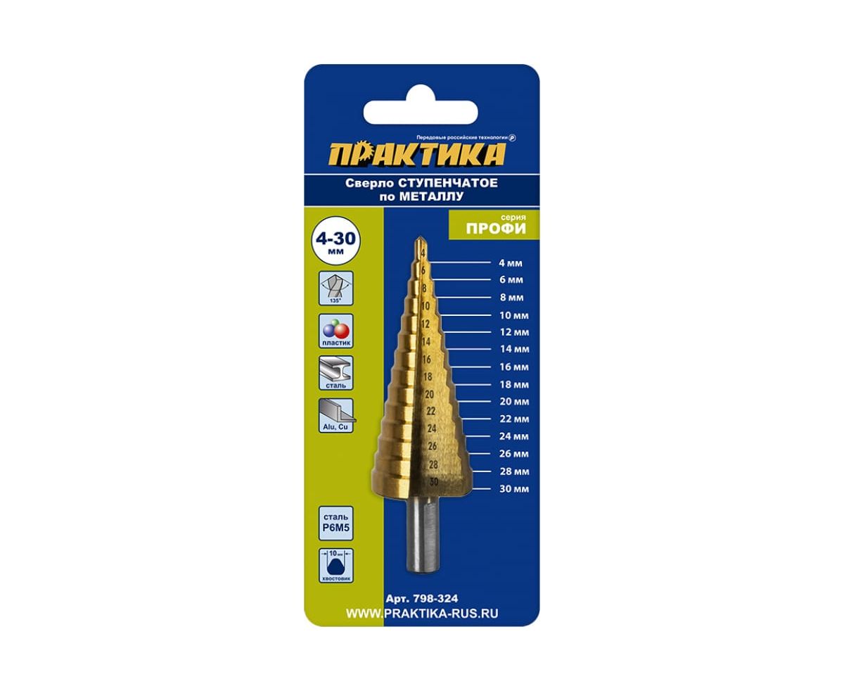 Сверло по металлу ступенчатое 4-30 мм шаг 2 мм TIN ПРОФИ ПРАКТИКА 798-324 предназначено для сверления отверстий в листовых металлических и пластиковых материалах.