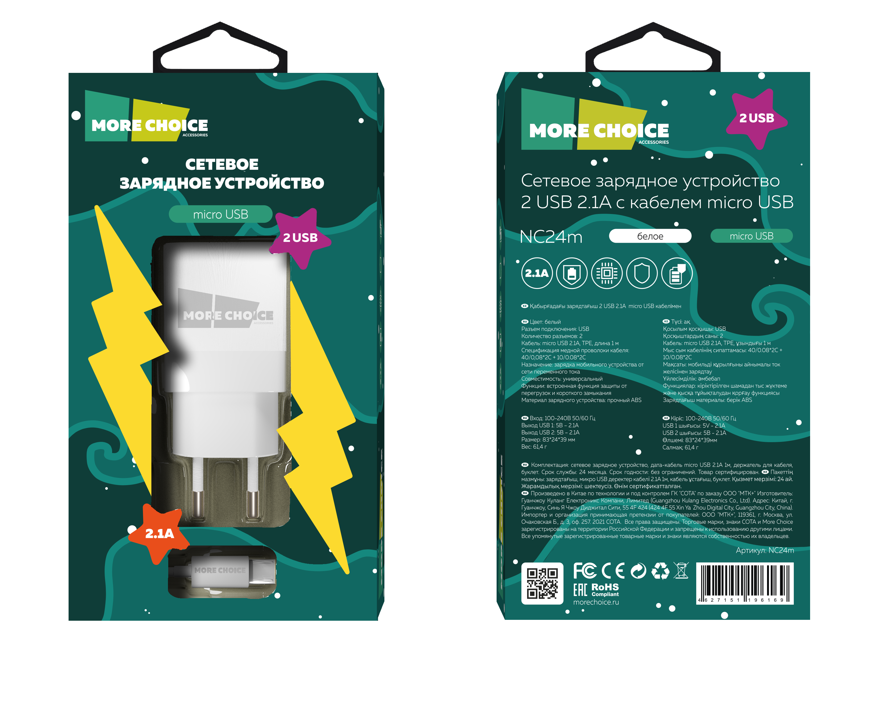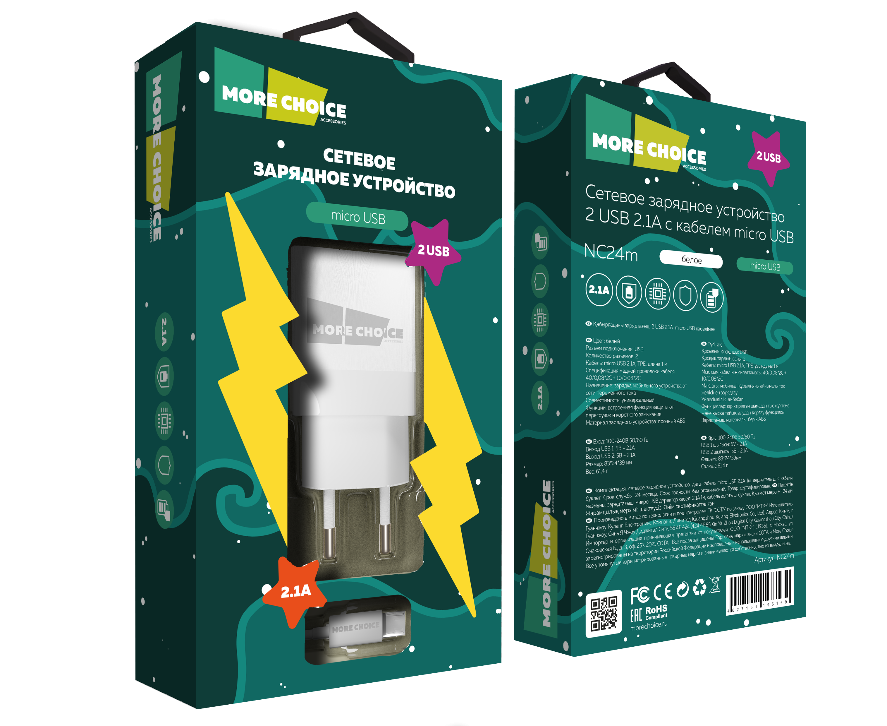 СЗУ 2USB 2.1A для micro USB More choice NC24m (White)