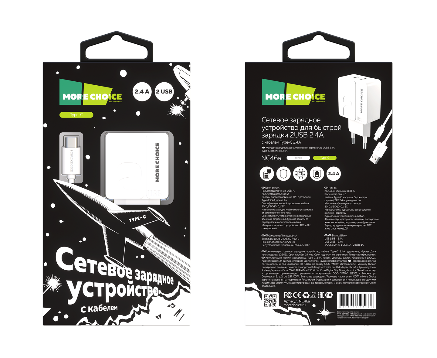 Материал: PC, ABS-пластик. Количество разъемов USB: 2 Вход: 100В/240В. Максимальный выходной ток: 2.4 A Дата-кабель в комплекте: Type-C (1 м) Комплектация: сетевое зарядное устройство, дата-кабель, держатель для кабеля, буклет Цвета: Black Black, White White, Black Grey, Green, Pink, White Grey