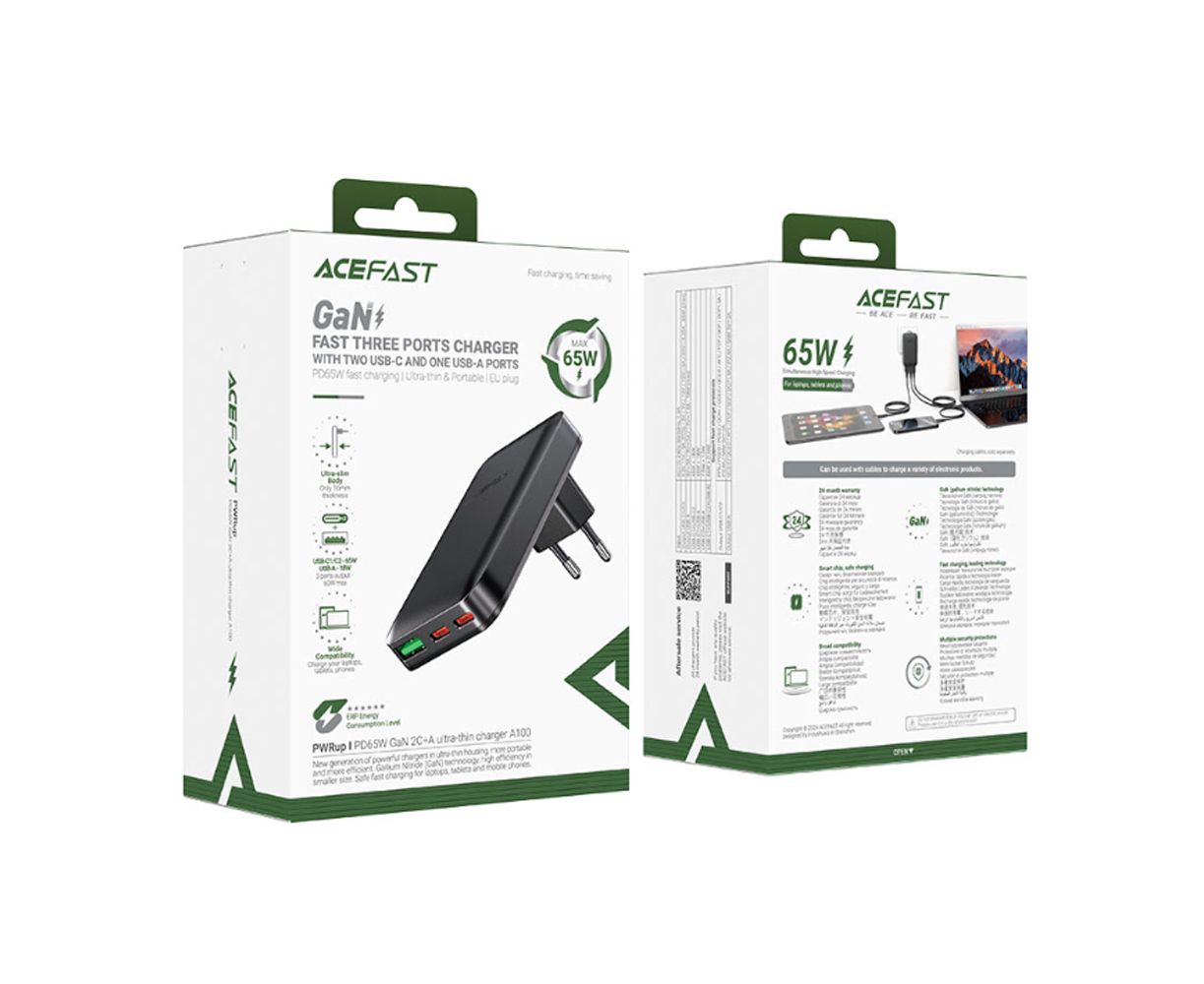 СЗУ ACEFAST A100 PD65 W Gan 2 USBC/1 USB-A Ultra-Thin Charger EU Black