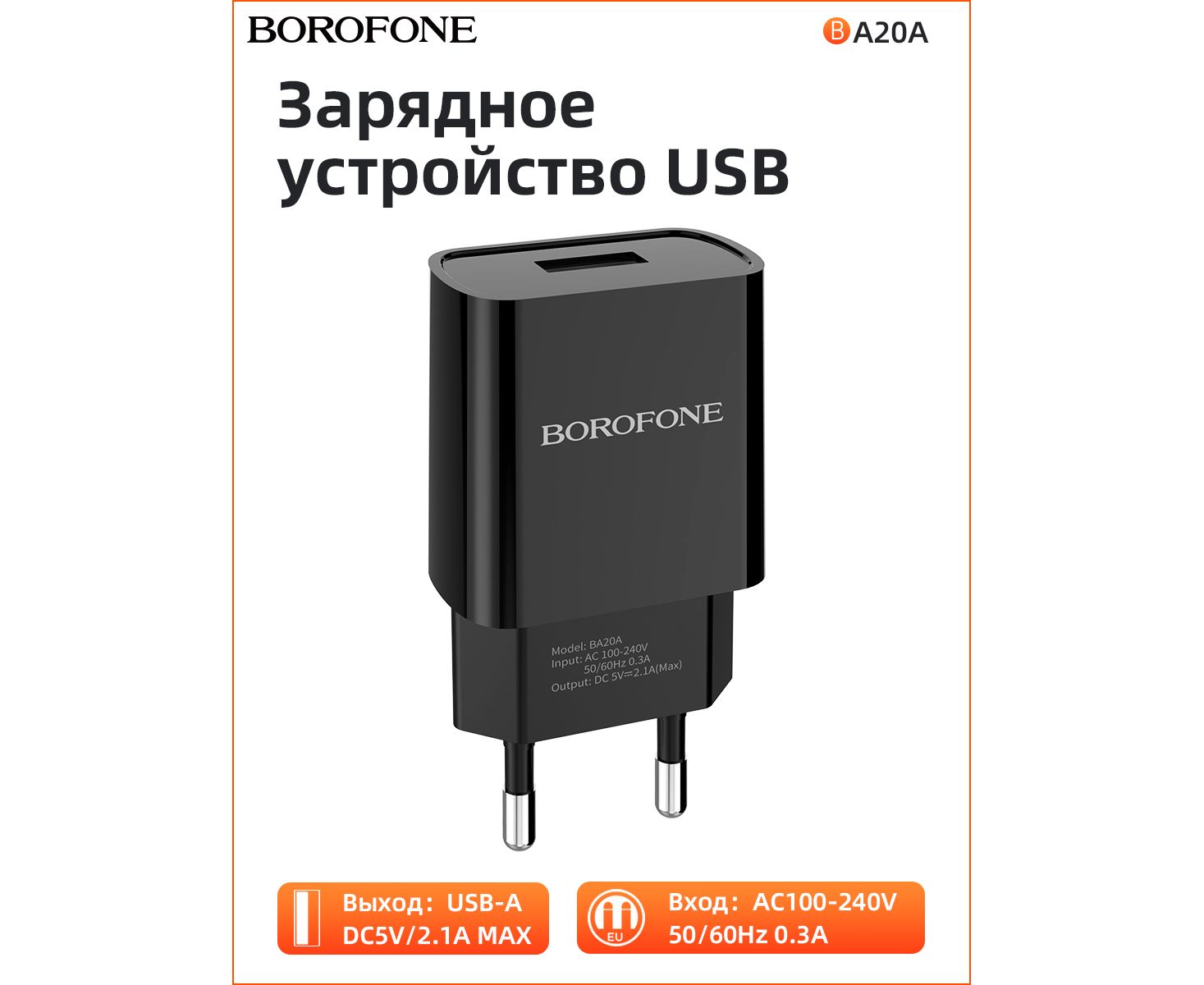 СЗУ BOROFONE BA20A Sharp 1USB, 5V, 2,1A (чёрный)
