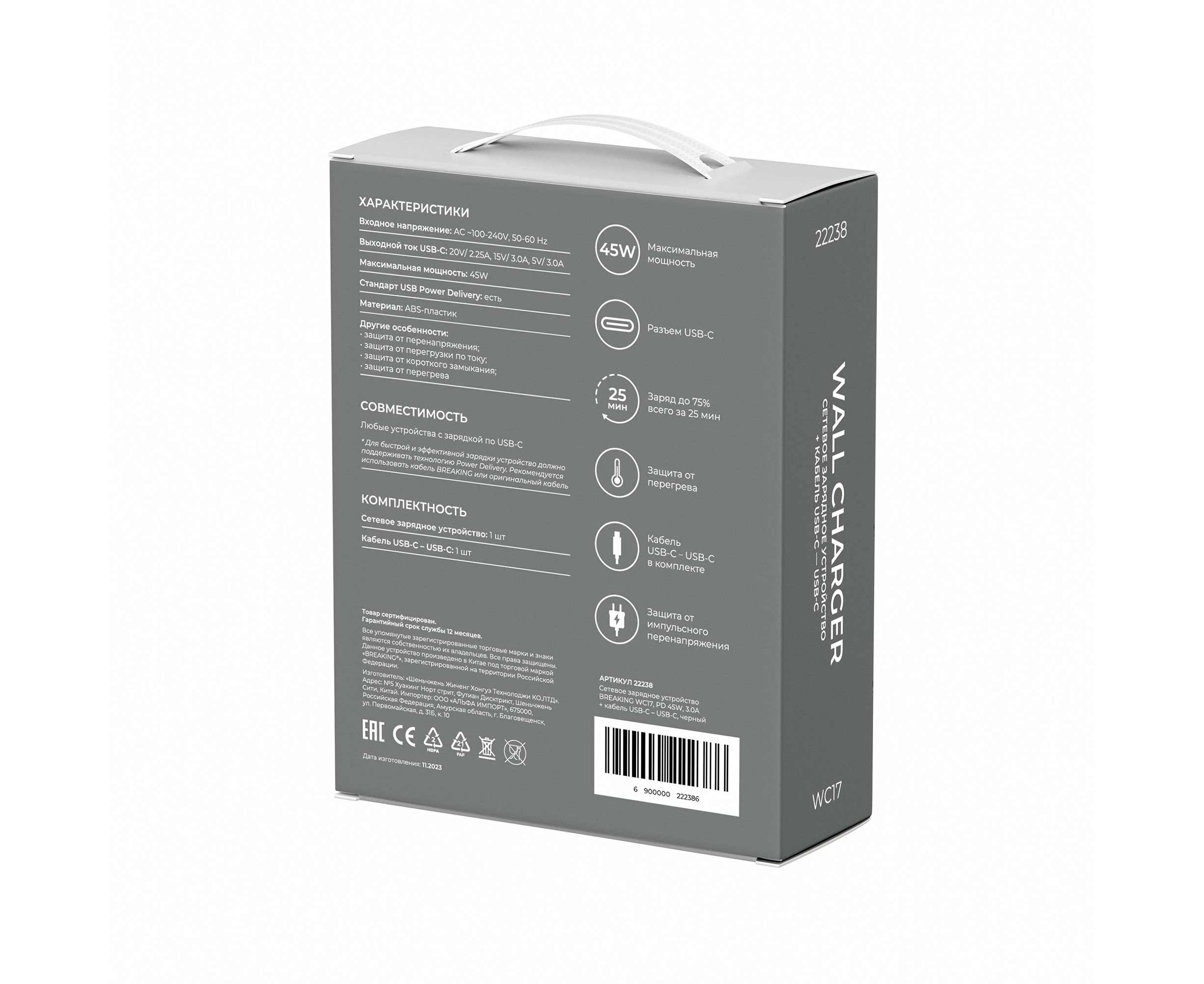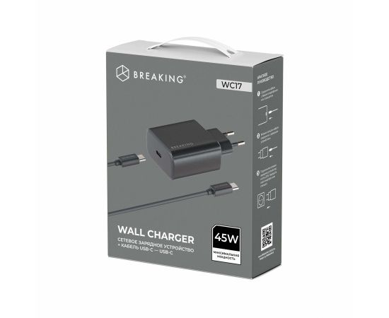 СЗУ Breaking WC17, USB-C, PD 45W, 3A + кабель USB-C - USB-C (Черный)
