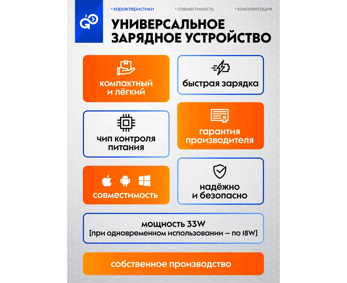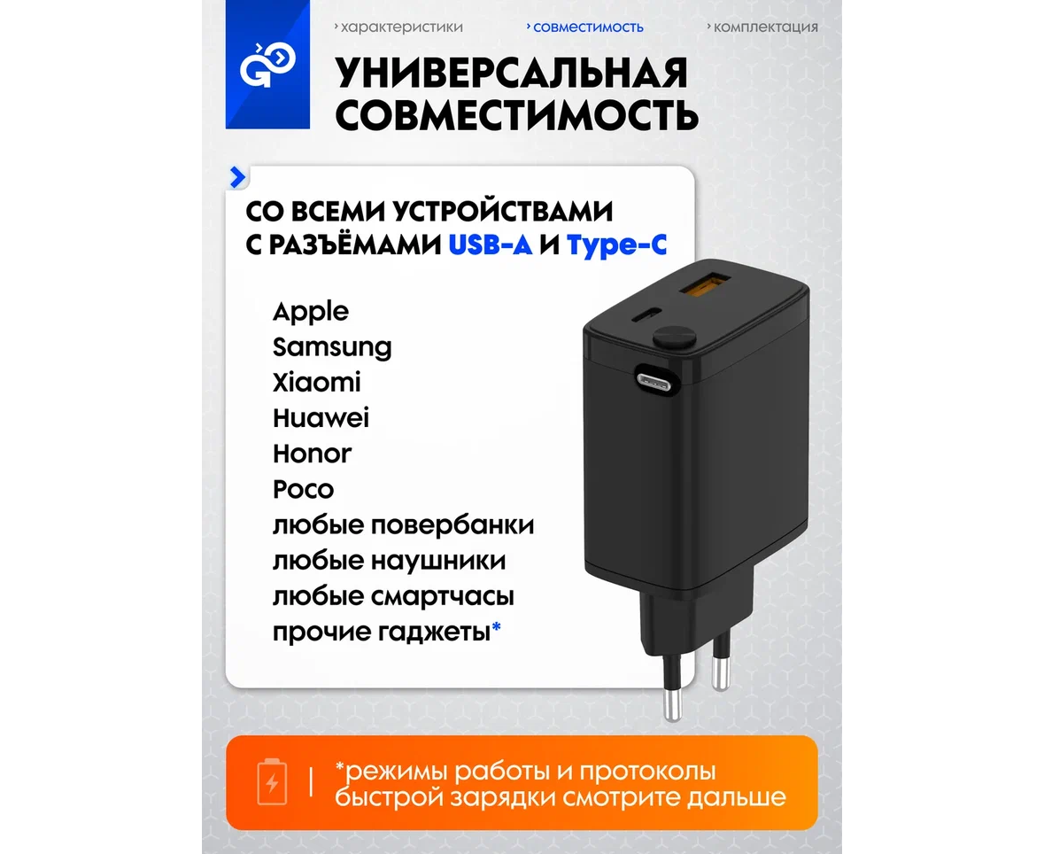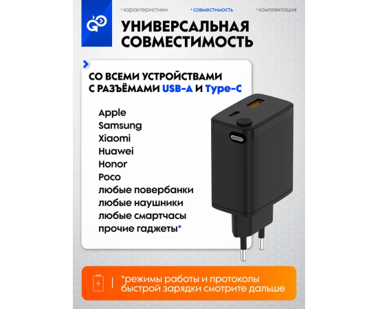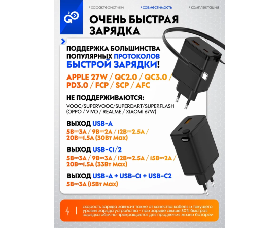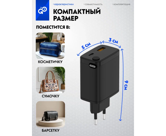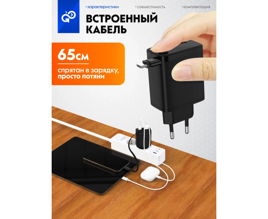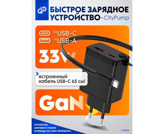 СЗУ GoGadget Портативная со встроенным скручиваемым кабелем CityPump 33W USB-C, 30WUUSB-A, GaN, кабель USB-C 33W Черный