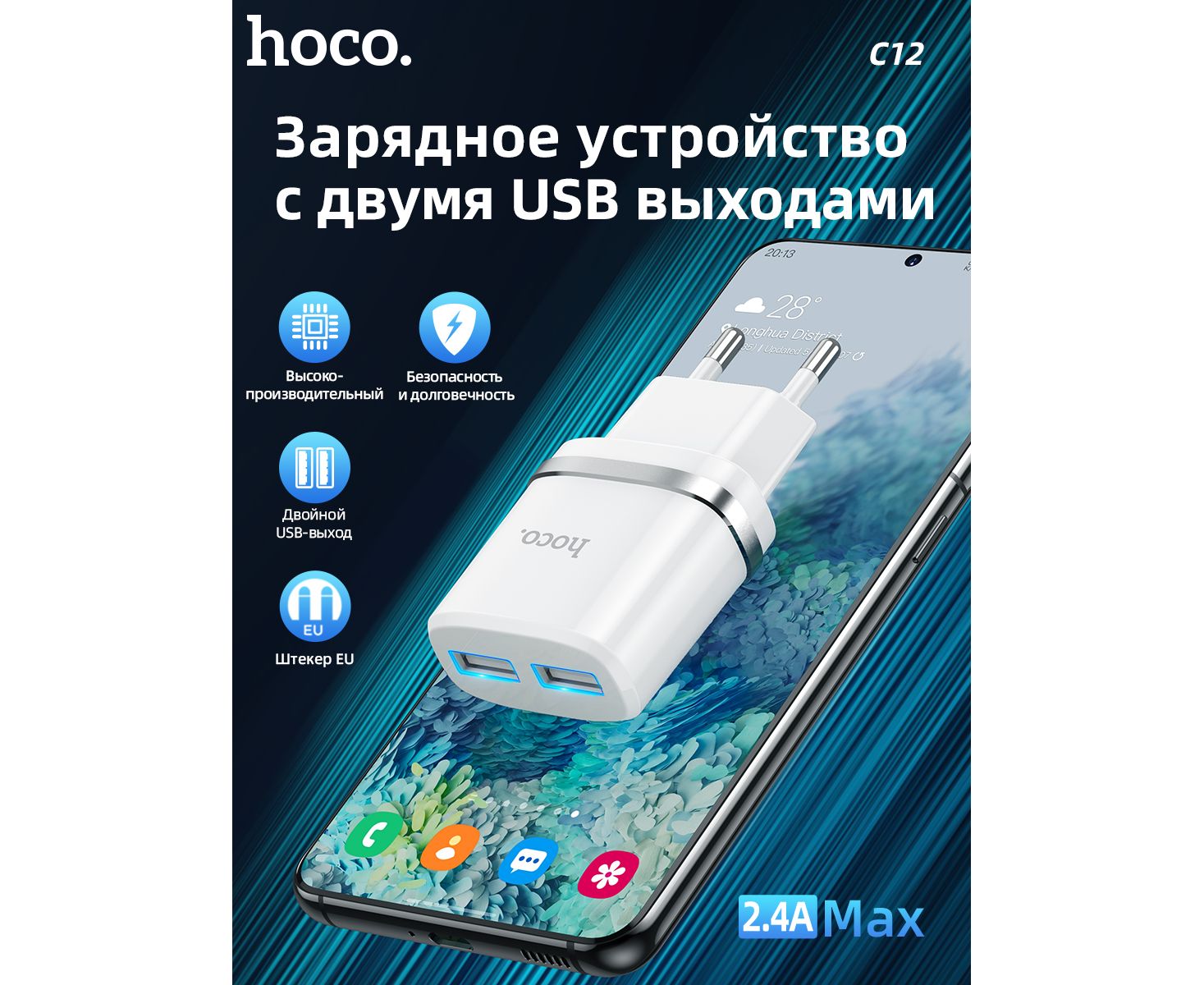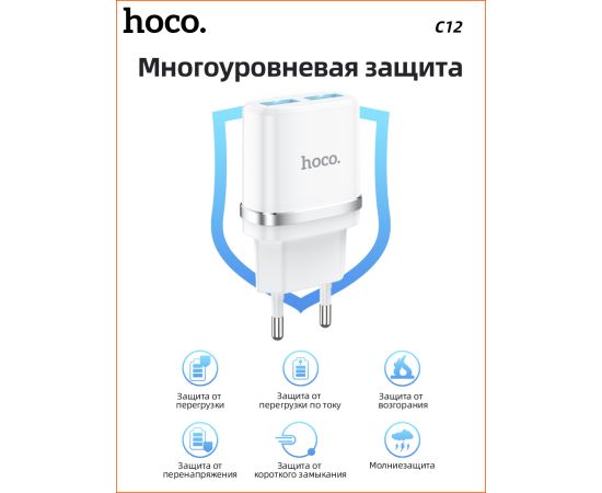 СЗУ HOCO C12, 2USB, 2.4A (белый)