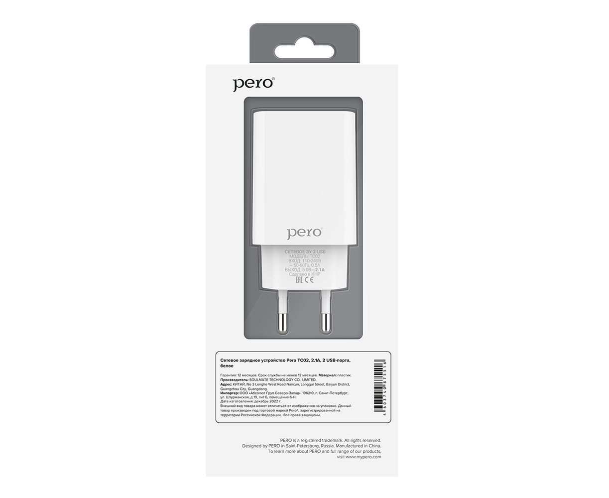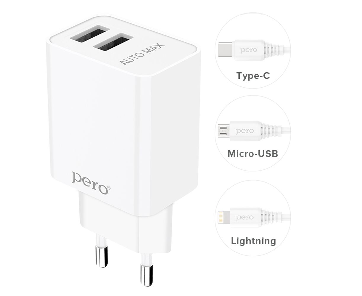 СЗУ PERO TC02 2USB 2.1A c кабелем Lightning в комплекте, белый