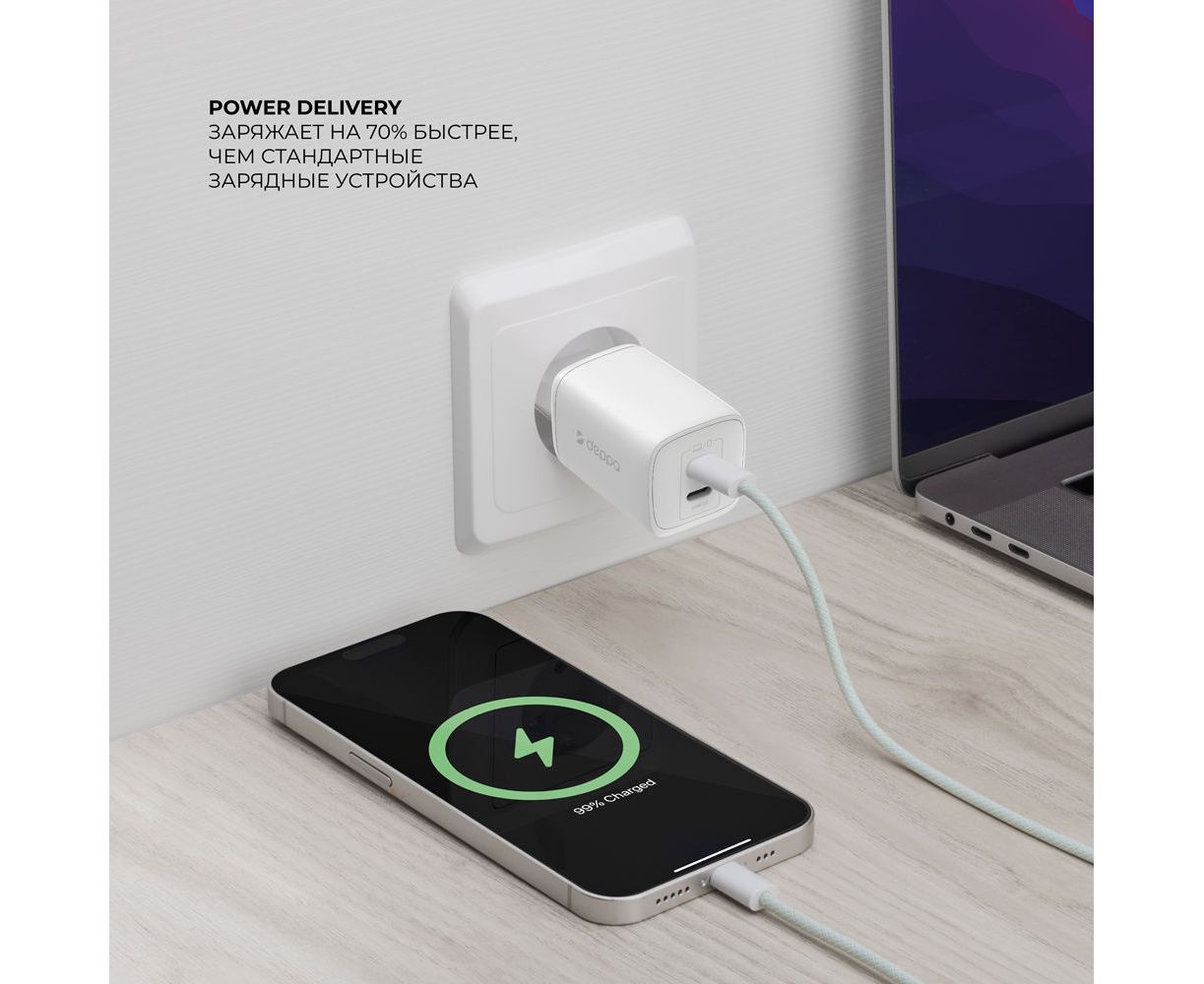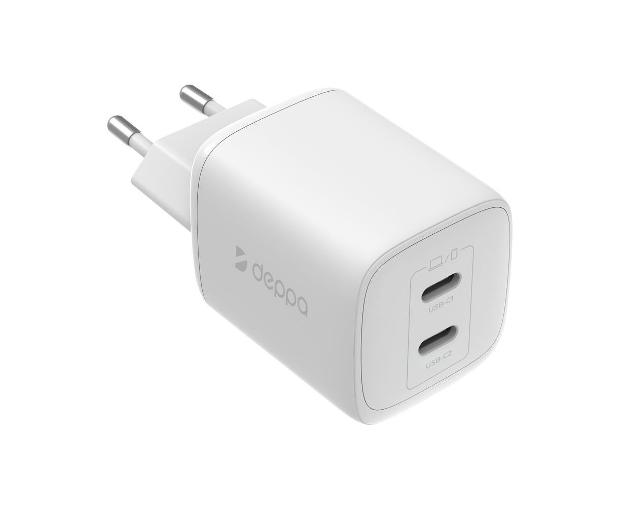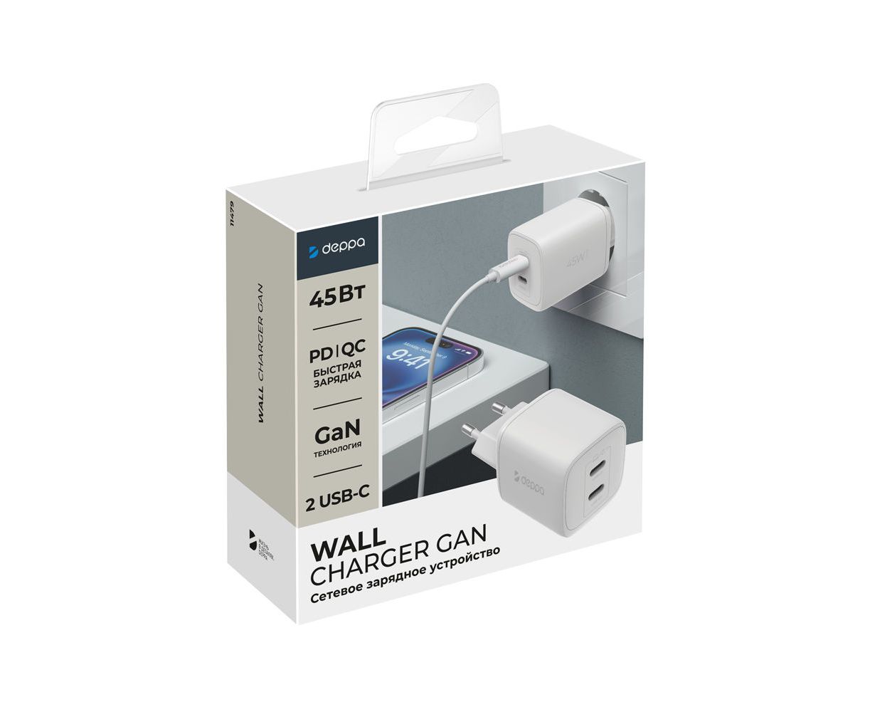 СЗУ 2xUSB-C, PD 3.0, QC 4.0+, 45W, GaN, белый, Deppa