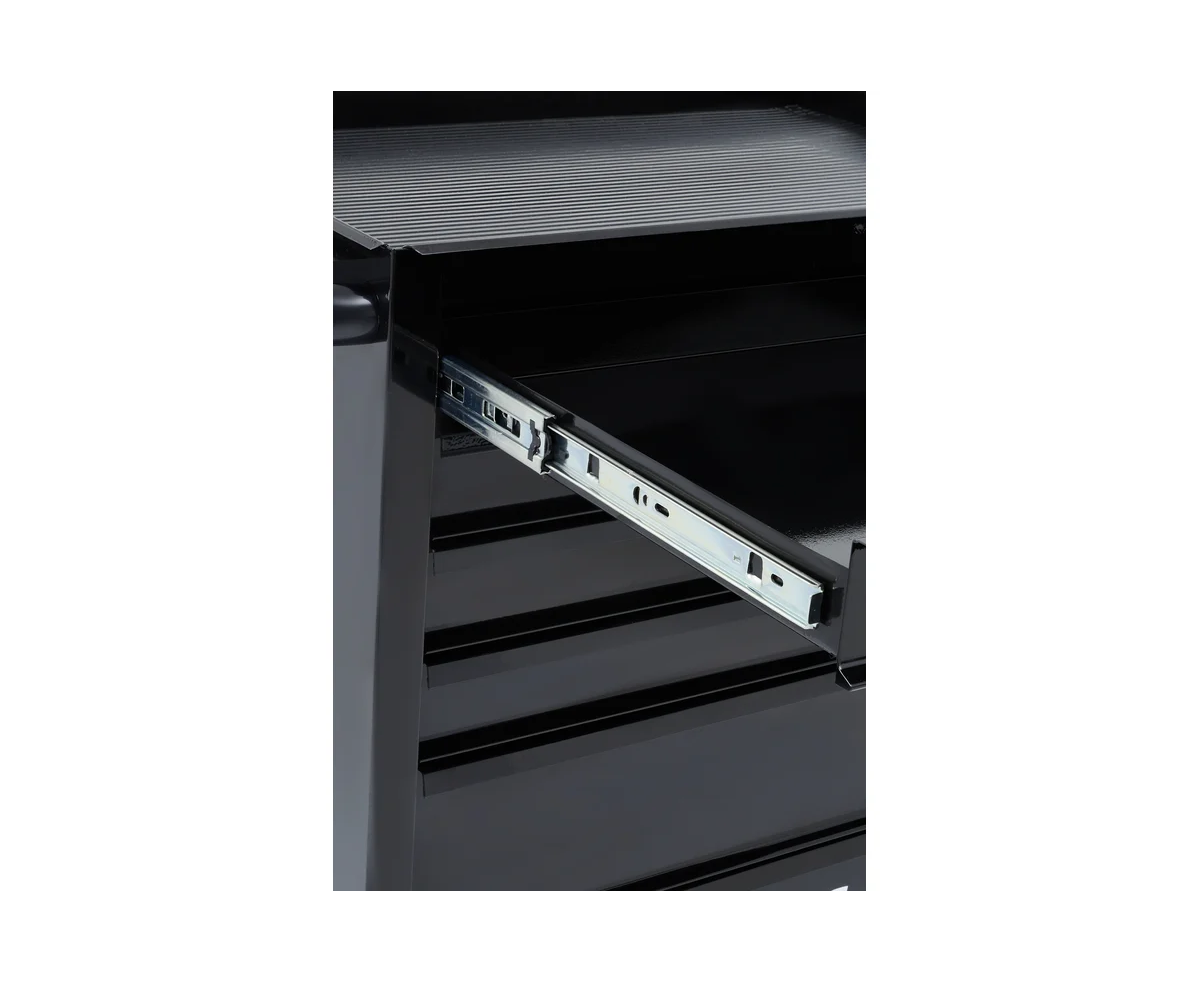 С помощью колес и ручки тележка легко и быстро перемещается по рабочей площадке. Верх конструкции покрыт резиновым материалом, который препятствует скольжению рабочего инструмента. Максимальная нагрузка на ящик - 30 кг. Толщина металла составляет 0.8 мм.