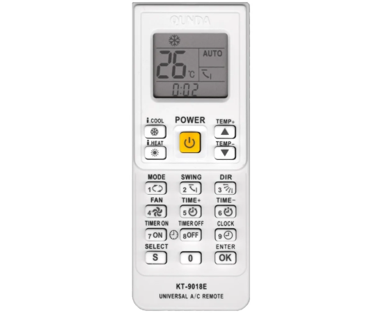 Универсальный пульт KT-9018E подходит на большинства сплит систем, 4000 кодов для разных фирм кондиционеров. Заменяет БЕСПРОВОДНЫЕ пульты от кондиционеров. Пульт KT-9018E высокого качества и прост в использование. Пульт необходимо настроить на вашу модель кондиционера. Он имеет функции как автоматического поиска , так и ручного поиска кода. Подробная инструкция прилагается к пульту. Автоматическим режимом можно воспользоваться, если вы не знаете какой у вас кондиционер или в таблице кодов нет вашей модели кондиционера. На пульте расположены основные функции: кнопка включения/выключения, регулировка температуры, выбор режимов, регулировка вентилятора, регулировка направления воздушного потока, таймер и часы.