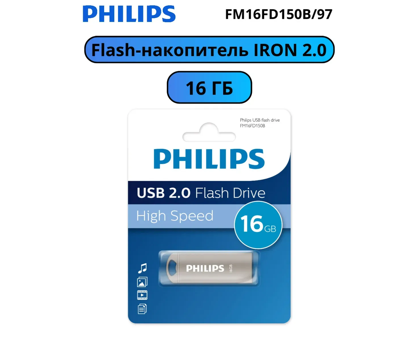 USB-флешка PHILIPS FM16FD150B/97 16GB Iron 2.0 16GB, USB 2.0