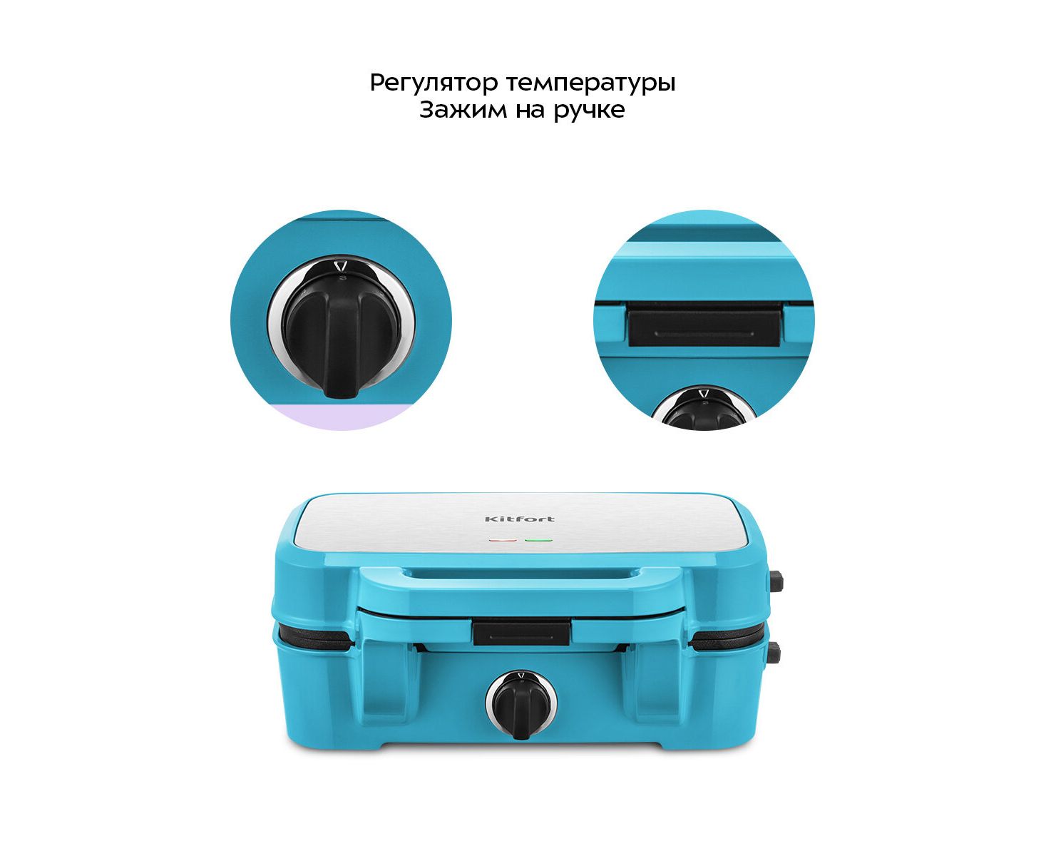 Вафельница оснащена регулятором температуры. Регулятор является ручкой термостата. На регуляторе нанесены цифры, соответствующие разной температуре нагрева вафельницы. Зажим на ручке удерживает крышку вафельницы в закрытом состоянии.