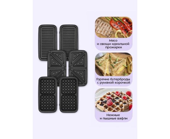 У прибора три пары панелей: панели для приготовления вафель, панели для приготовления бутербродов и ребристые панели для гриля. Высокая температура нагрева панелей способствует быстрому приготовлению продуктов. Панели съёмные, их удобно мыть под водой.