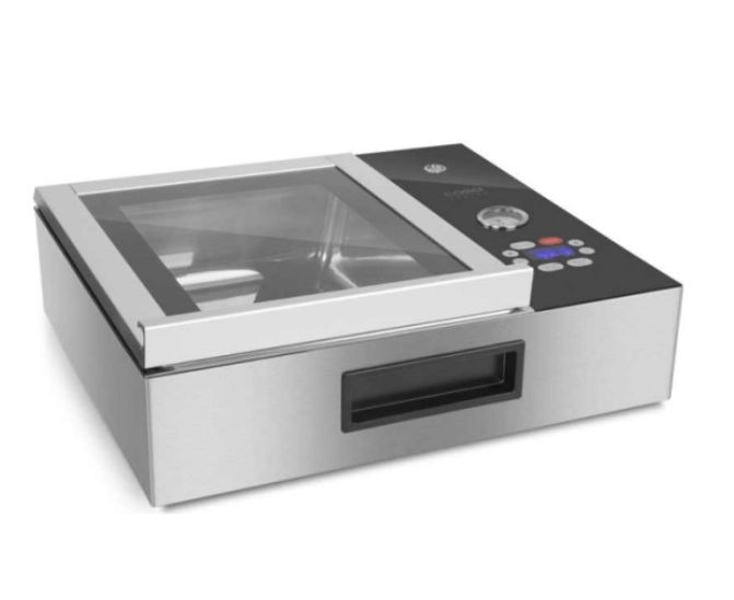 VacuChef Slimline - премиальное устройство компании Caso, который сочетает в себе компактный размер и плоскую форму, экономя место на вашей кухне, и характеристики лучших моделей линейки VacuChef . Корпус и внутренняя камера прибора изготовлены из прочной нержавеющей стали, верхняя крышка сделана из закаленного стекла для того, что вы могли следить за процессом вакуумирования, объем внутренней камеры около 8 л.