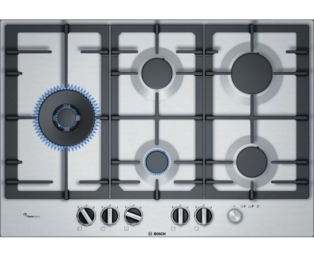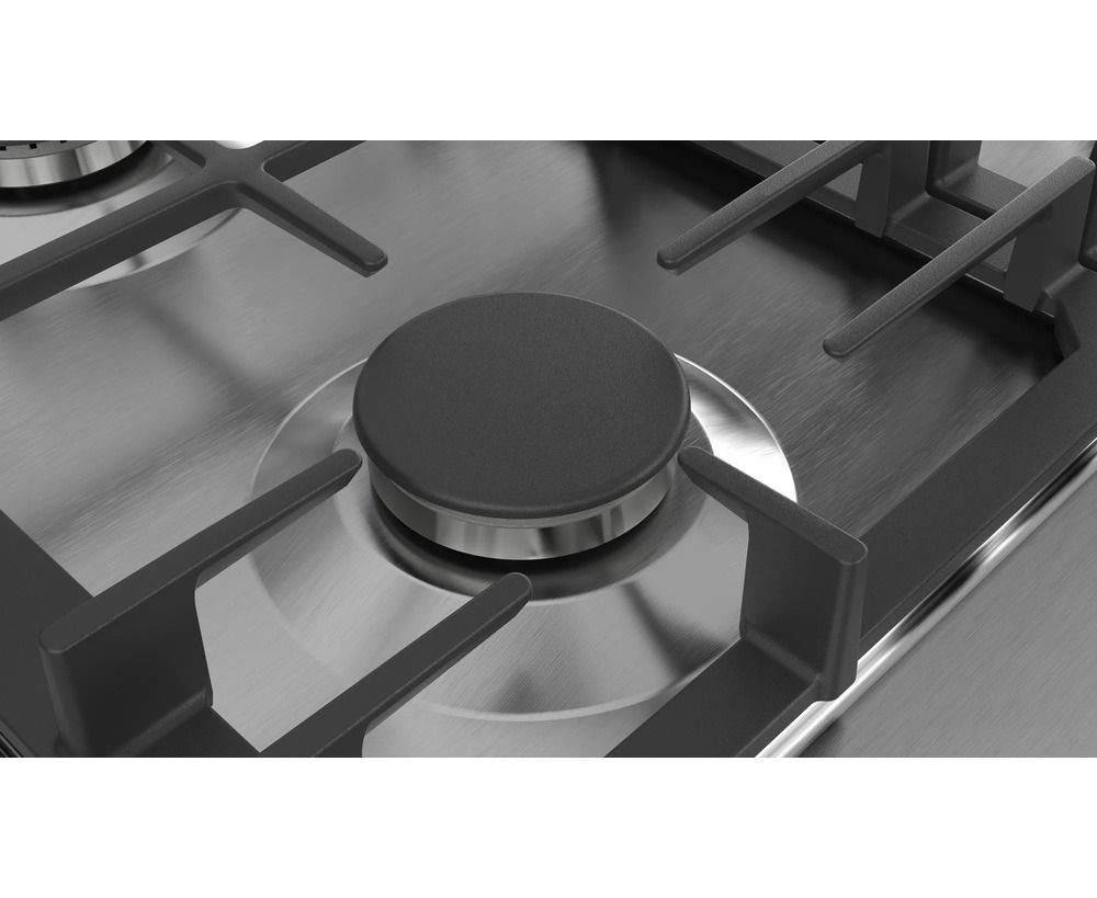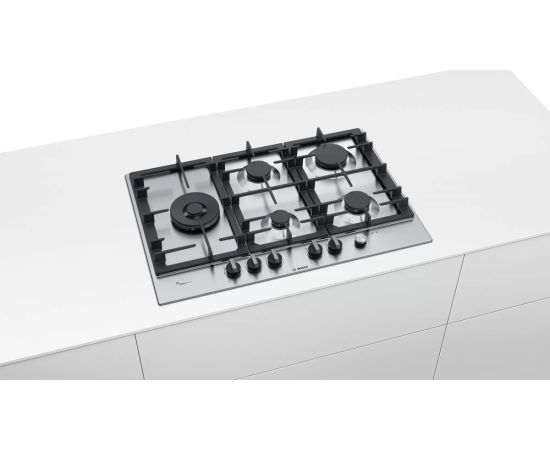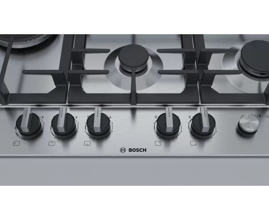 Встраиваемая варочная поверхность BOSCH PCS7A5I90 Газ, 75см, нерж.сталь, независимая, нержавеющая сталь, чугунные решетки