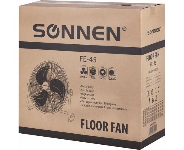 Вентилятор повышенной мощности SONNEN FE-45A обладает электромотором мощностью 120 Ватт, чем сильно выделяется на фоне классических напольных вентиляторов.