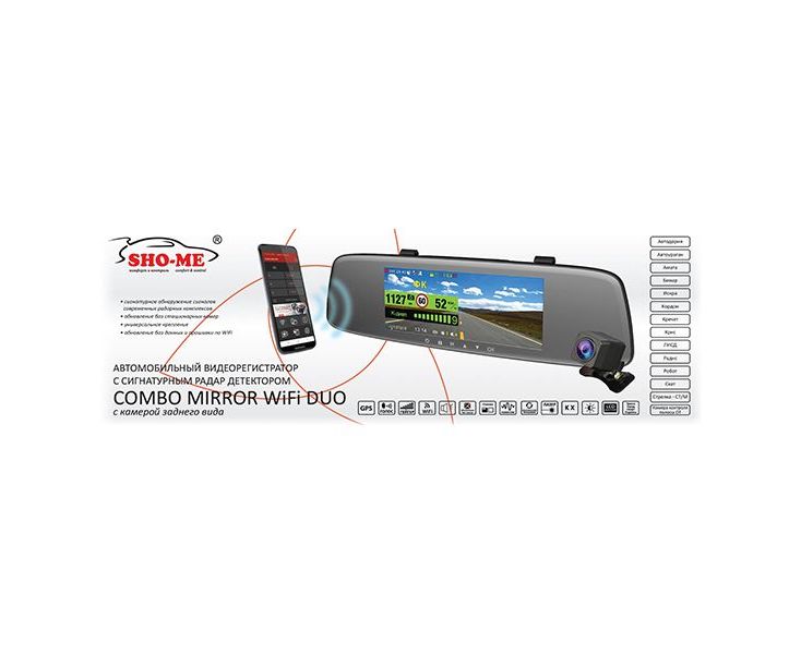 Sho-Me Combo Mirror WiFi DUO - прогрессивная модель комбо устройства Sho-Me в корпусе зеркала заднего вида с сигнатурным режимом фильтрации помех, камерой заднего вида и WiFi модулем .