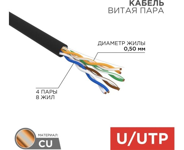 Кабель витая пара черного цвета REXANT используется для создания локальных сетей компьютерных сетей, подключения устройств охранной системы, телефонии, интернета, камер видеонаблюдения и т.п. Гибкая форма обеспечивает удобное размещение кабеля в труднодоступных местах без образования заломов на местах сгиба. Относится к категории 5е.