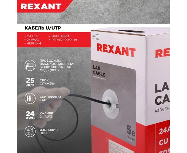Технические характеристики REXANT OUTDOOR витая пара, 4PR, 24AWG, CAT5e 01-0045
