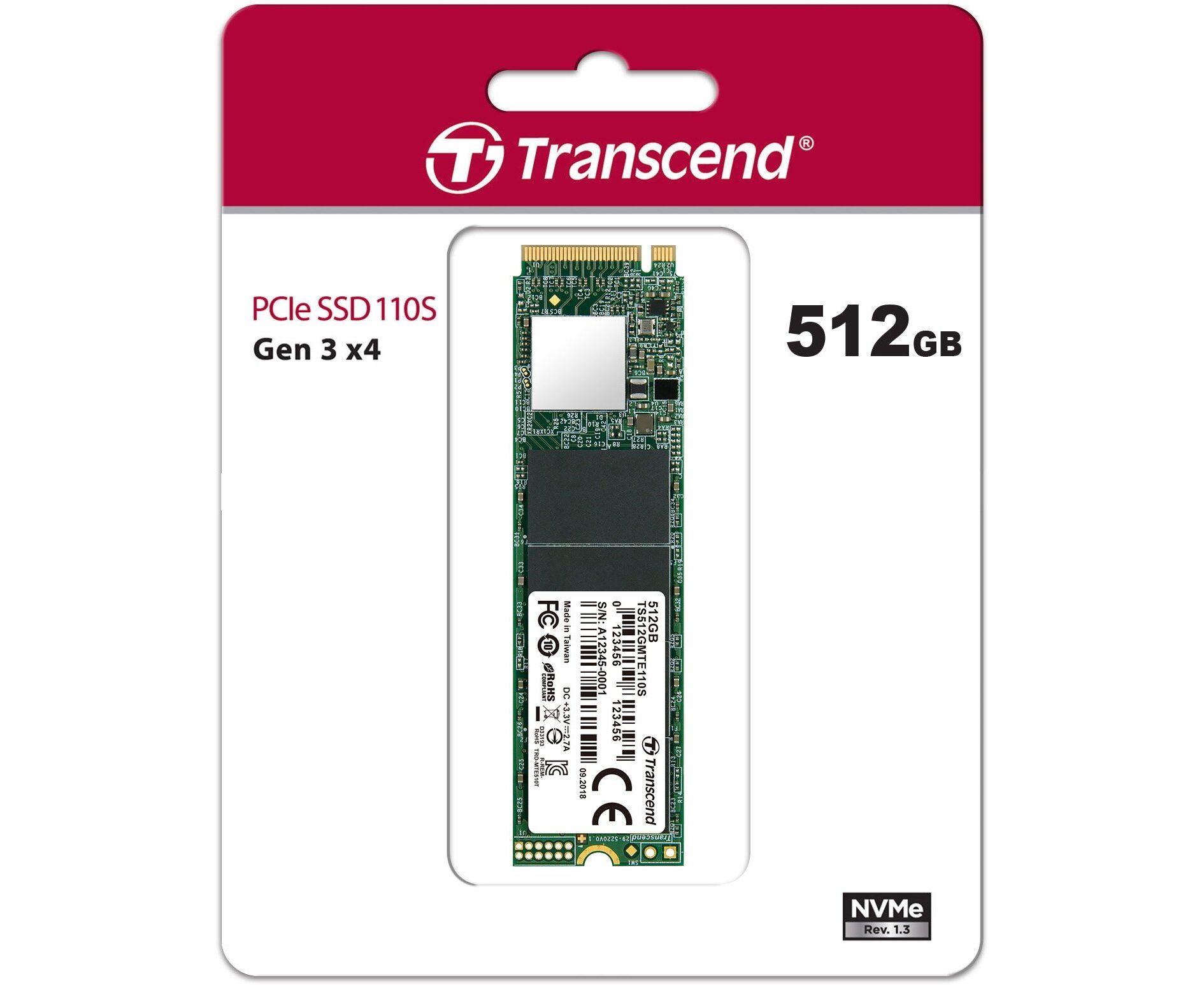 Внутренний SSD Transcend 512GB MTE110S, PCIe 3.0 x4, R/W - 1500/1800 MB/s, (M.2), 2280, 3D TLC NAND
