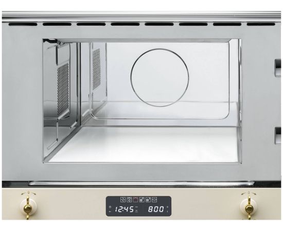 Микроволновая печь SMEG MP822PO имеет все необходимые функции — от разогрева до многоэтапной готовки. Благодаря встраиваемой конструкции она не занимает много места. Внутренняя камера выполнена из нержавеющей стали. Поворотные переключатели Coloniale, изготовленные из латуни, позолочены. Прибор имеет откидной гриль.