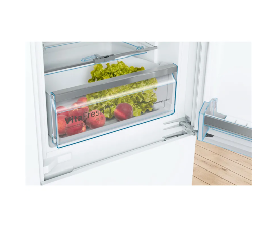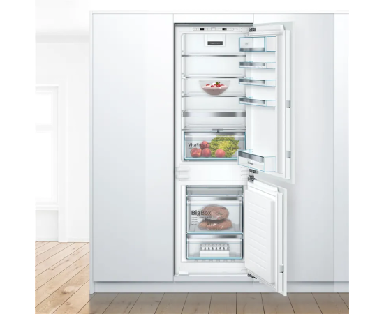 Встраиваемый холодильник Bosch KIN86AF3M8 с нижней морозильной камерой и общим полезным объемом 255 л. Полки комбинированного холодильника-морозильника выполнены с «металлической» аппликацией. Установить и регулировать рабочие температуры в камерах можно на панели с LCD дисплеем. Удобно хранить крупногабаритные замороженные продукты в контейнере BigBox. В двухкамерном KIN86AF3M8 фиксированный фронт.