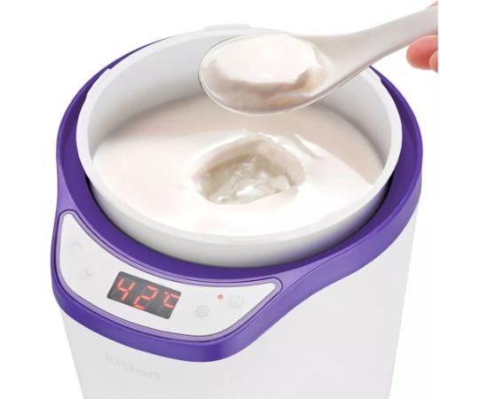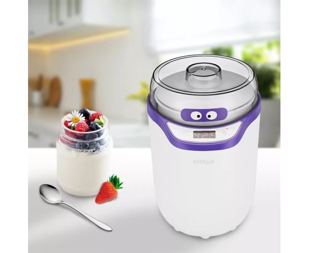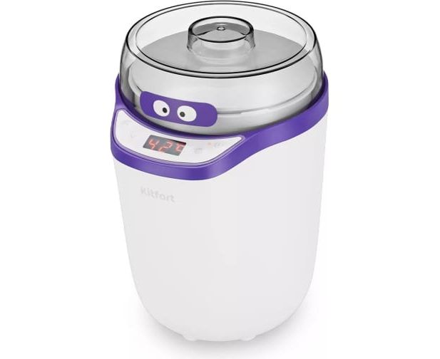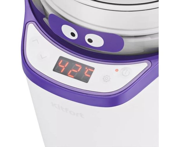 Йогуртница KITFORT бело-фиолетовая КТ-2077-1 бело-фиолетовая предназначена для приготовления вкусного и полезного домашнего йогурта. Смешайте молоко и закваску в контейнере, установите контейнер в йогуртницу, выберете подходящую программу или выставьте время и t, затем нажмите кнопку включения. Йогуртница равномерно нагревает контейнер с ингредиентами, поддерживая заданную температуру, и автоматически отключает нагрев по истечении заданного времени.
