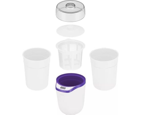 Прибор укомплектован 2 контейнерами на 1,8 ли 1,6 л с крышкой, в которых йогурт можно хранить в холодильнике. В комплекте также есть сито для приготовления греческого йогурта, творога или сыра. Все части легко разбираются, моются и компактно хранятся.