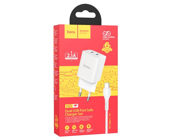 Сетевое зарядное устройство HOCO N25 Maker 2xUSB с Кабелем USB - Type-C, 2.1A, 10W, белый