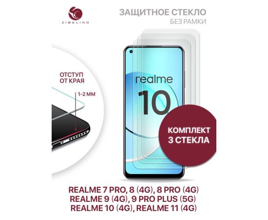 Защитное стекло (Комплект 3 шт) для Realme 7 Pro, 8 4G, 8 Pro 4G, 9 4G, 9 Pro Plus 5G, Realme 10 4G, 11 4G без рамки с отступом от краев, Реалми 7 Про 8 Про 9 Про Плюс 5G 10 11