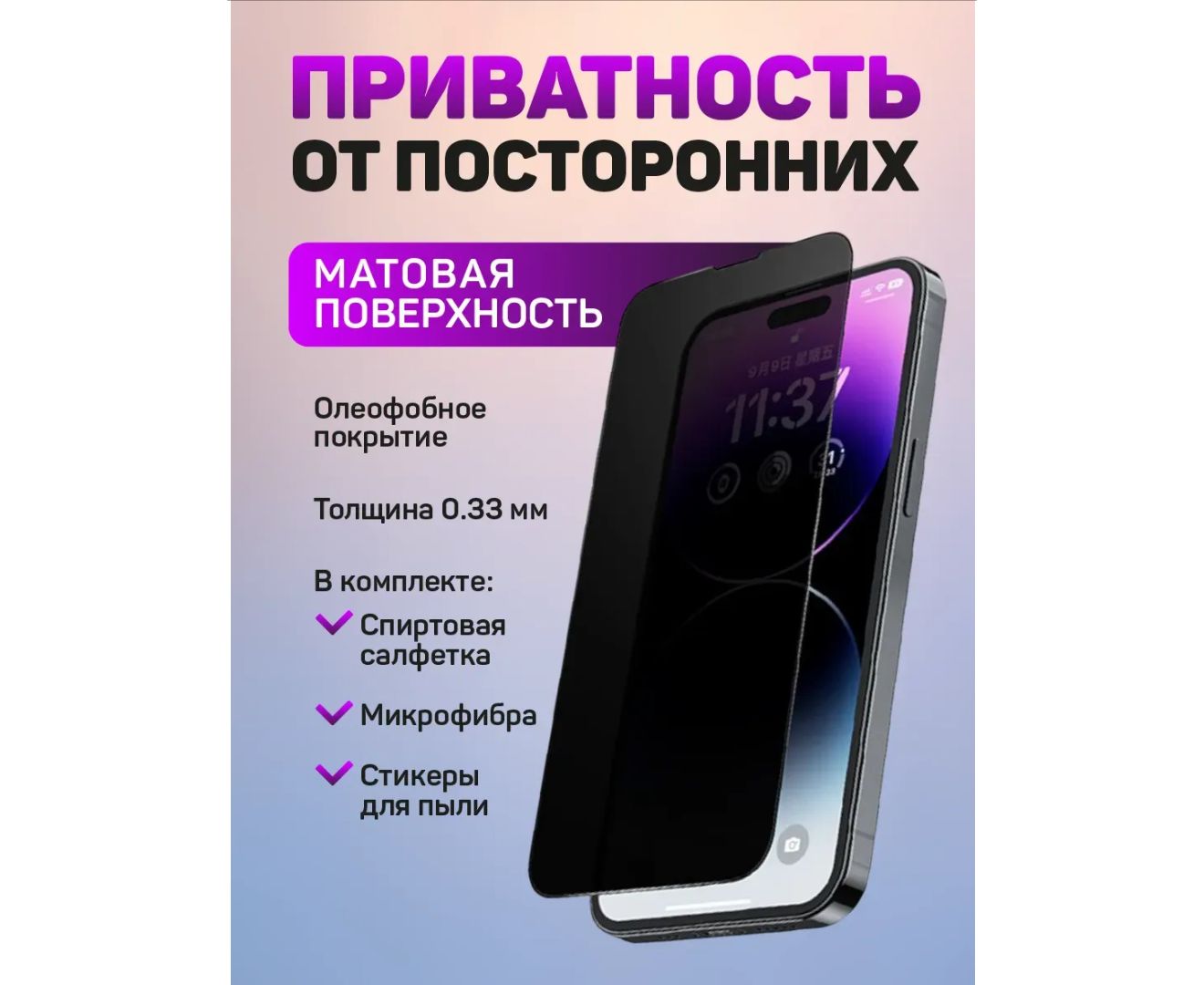 Если вы постоянно используете глянцевые защитные стекла Антишпион и вам надоело каждый раз протирать поверхность стекла от загрязнений, отпечатков пальцев,а так же блики солнечного света, мы готовы предложить вам одно решение - это матовое защитное стекло премиальной серии антишпион . Оно обладает противоударными свойствами. Изготовлено по особой технологии закалки стекла и соответствует высокому коэффициенту механической прочности. По сравнению с глянцевым защитным стеклом имеет множество достоинств. Из плюсов, особенно, можем отметить следующее: отличное прилегание к экрану смартфона; в большинстве случаев приклеивается к дисплею телефона без пузырей; устойчиво к царапинам; чувствительность экрана остаётся прежней; не преломляет изображение; имеет минимальную толщину ; не заметно при использовании смартфона; антибликовое покрытие предотвращает отражение лучей света; на поверхности стекла не остаются следы от пальцев и других загрязнений; коэффициент твердости – 9H; самая главная особенность при совокупности больших плюсов, стекло имеет функцию «антишпион». Уникальность данного защитного стекла является то, что под определенным углом, около 30 градусов по горизонтали, изображение экрана смартфона становится трудночитаемым посторонним наблюдателям. Комплект может включать в себя 1, 2 или 3 защитных стекол. При заказе большего количества стекол, цена одного стекла становится выгоднее. Для каждого стекла в комплекте идут аксессуары для установки: спиртовая салфетка и сухая салфетка, стикеры для удаления пыли, гарантийный талон. Перед отгрузкой, каждое стекло просматривается на наличие дефектов. Но если вы обнаружили брак при получении, не спешите расстраиваться и писать негативный отзыв. Просто, напишите нам в отдел поддержки или свяжитесь с нами. Мы решим вашу проблему по замене бракованного товара. Стекло совместимо с iphone 15