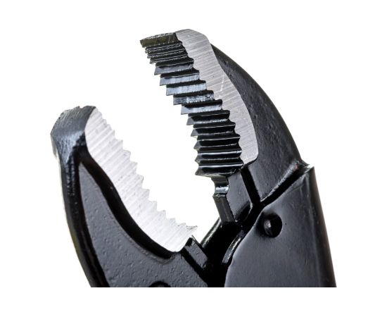 Ручной зажим выполнен из хромованадиевой стали высокого качества и имеет специальное покрытие, защищающее его от коррозии. Он используется для закрепления и удержания заготовок при сварке и прочих работах. Фиксация осуществляется при сжатии ручек до упора благодаря механизму блокировки. Регулировать усилие закрепления деталей можно с помощью специального винта. Поверхность губок закалена для долгого срока службы.