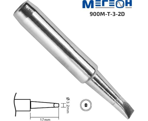 МЕГЕОН 900M-T-3.2D - клинообразное жало с диаметром рабочей части 3,2 мм. Жало совместимо с паяльниками станций: 00160, 00180, 00207, 00308, 00309, 00310, 00335, 00336, 00337, 00361, 00362, 00363, 00503, 00522, 00562, 00680, 00385, 00686 и другие.