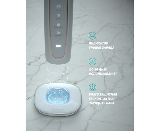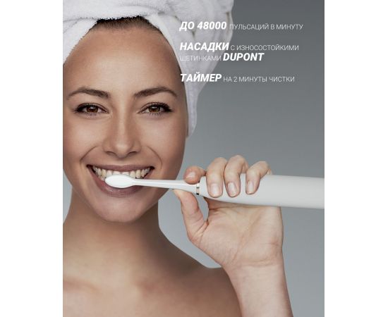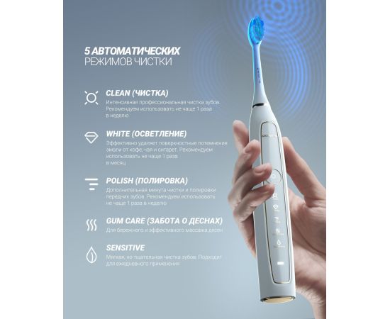 Особенности: 5 Режимов работы: Sensitive/Clean/White/Polish/Gum Care: режим Clean: 41000 пульсаций/мин, режим White: 48000 пульсаций/мин, режим Polish: 45000 пульсаций/мин, режим Gum care: 35000 пульсаций/мин, режим Sensitive: 31000 пульсаций/мин.